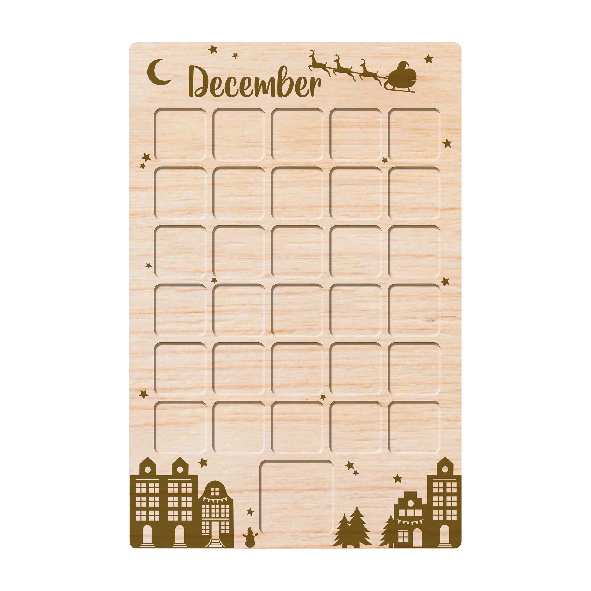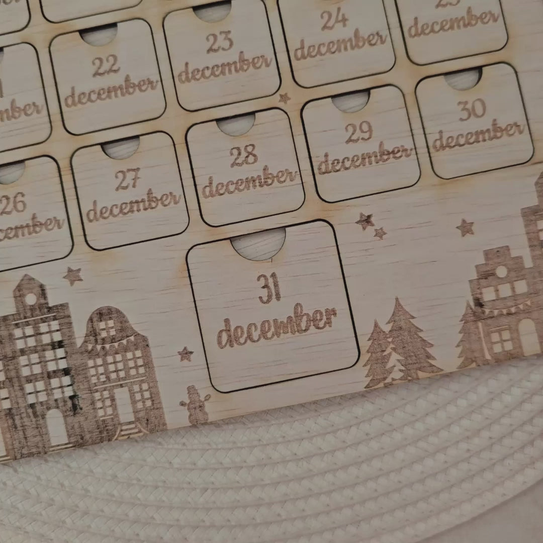 Met dit super handige aftelbord kan jij samen met je kind(eren) bijhouden over hoeveel dagen de feestdagen zijn. Bij het aftelbord zit een stickervelletje, met 2 speculaaskoekjes, 2 camera's, 2 cadeautjes, een kerstboom, 1 school, 1 kerk, 1 vuurpijl en de cijfers 1 en 2. Deze stickers kan je gebruiken om verschillende activiteiten aan te geven, zoals koekjesbakken, kerstfilm kijken, kerstboom zetten en kerst op school. Wij snijden het aftelbord met behulp van een laser graveermachine, hiermee graveren wij ook de tekst op het bord. Zodat de tekst permanent op het bord staat. Bij het bord leveren wij ook een stickervel met de 12 silhouette stickertjes.