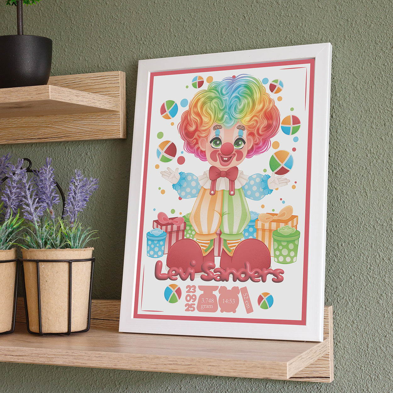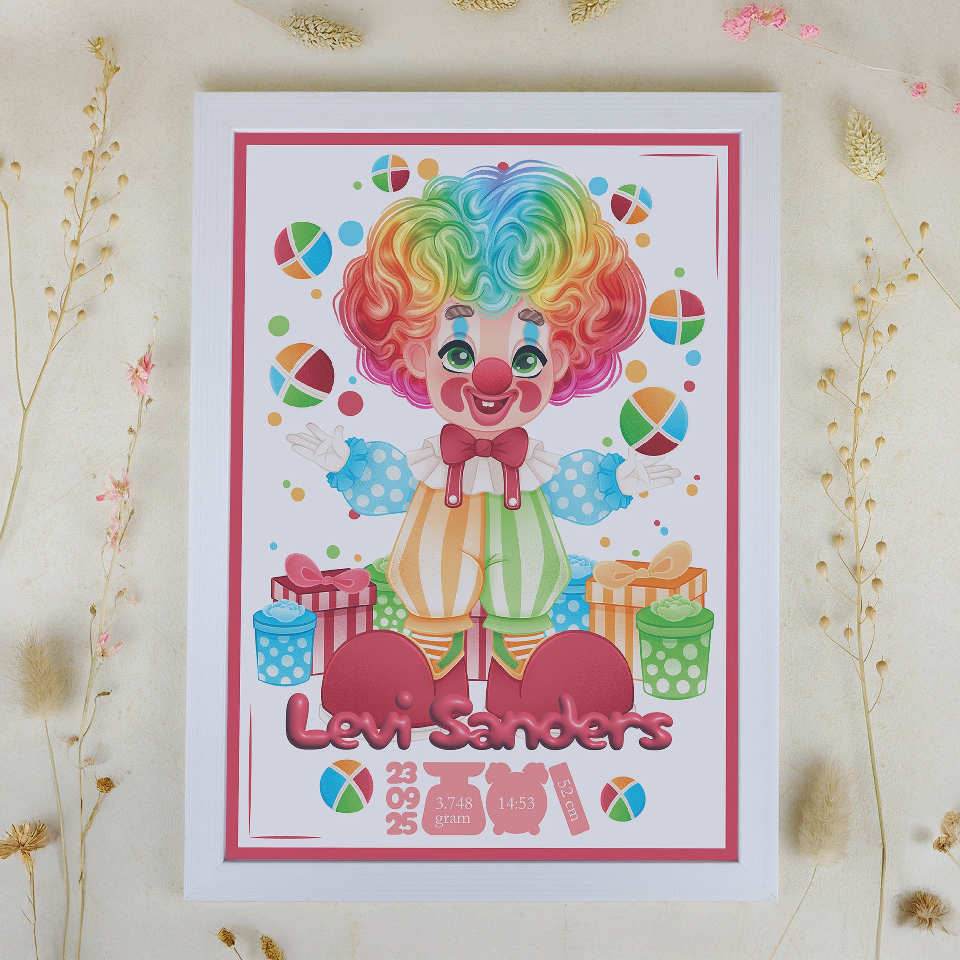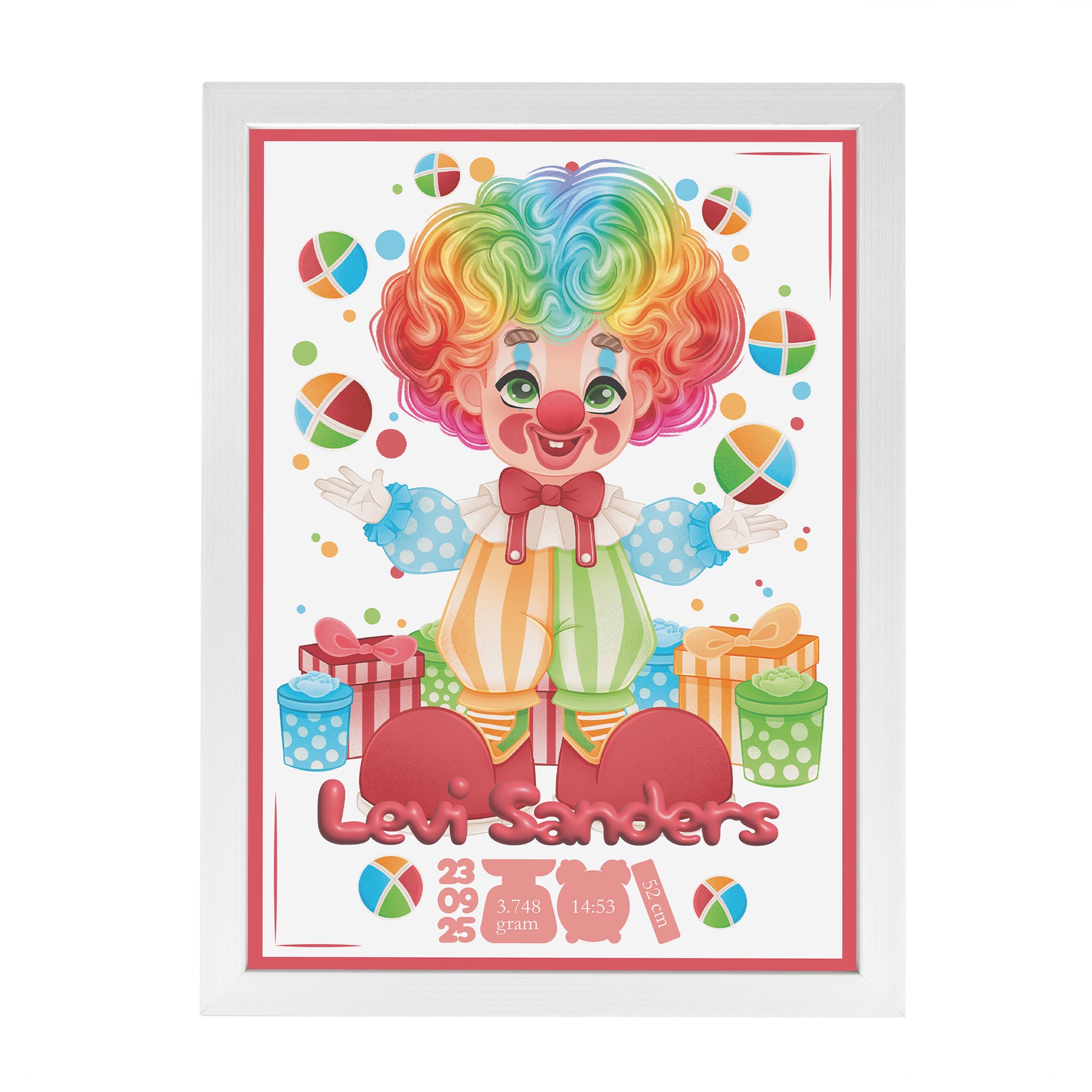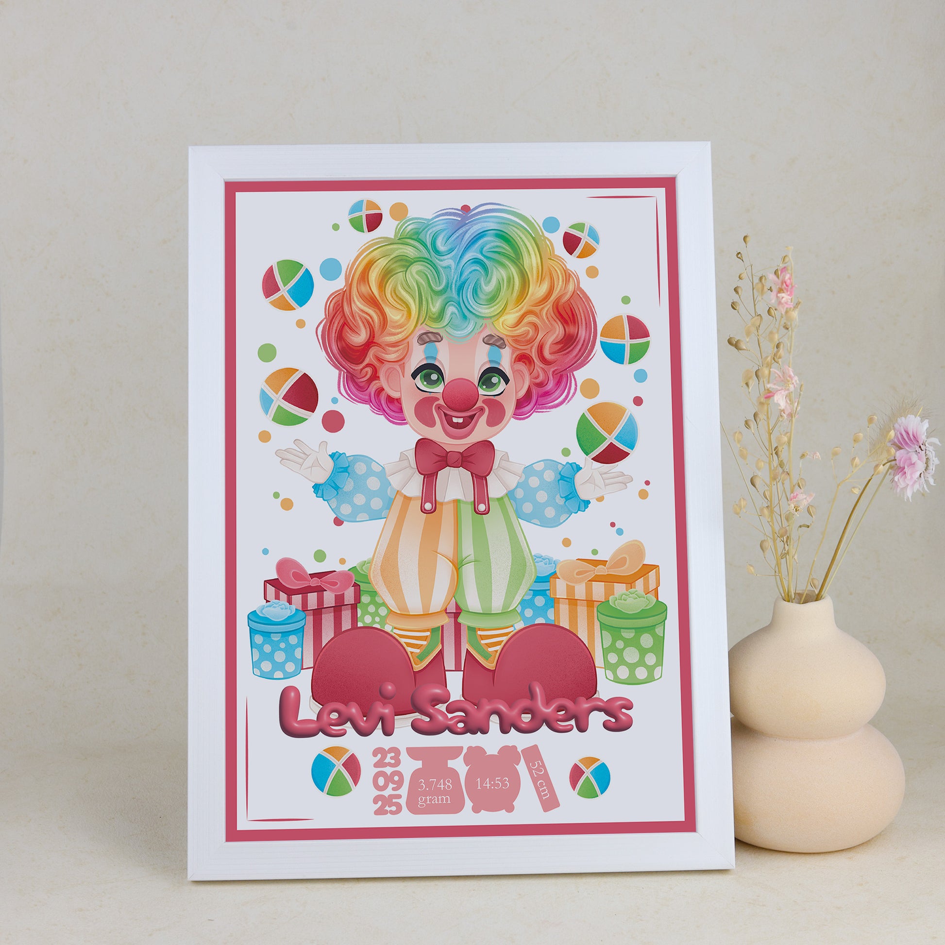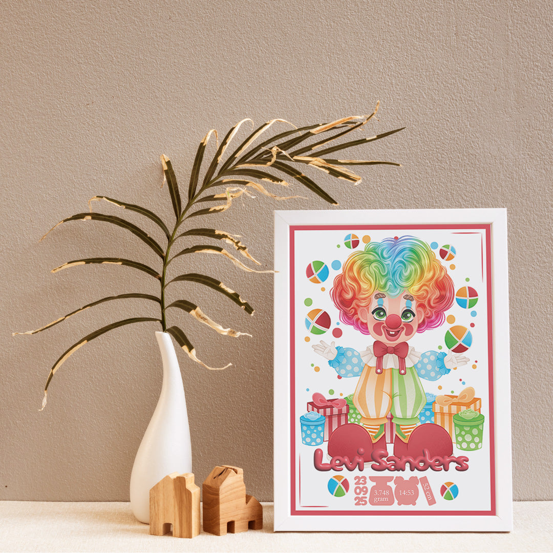 Breng een glimlach in de babykamer met deze kleurrijke geboortelijst! De speelse illustratie van een clown die ballen omhoog gooit, is met liefde en oog voor detail door Presents2Give zelf ontworpen – echt uniek dus. Onder de tekening schittert de naam van de pasgeboren baby, met daaronder alle belangrijke geboortedetails: de datum, tijd, het gewicht en de lengte. Een bijzonder én persoonlijk kunstwerk dat meteen een plekje in het hart én aan de muur verovert.