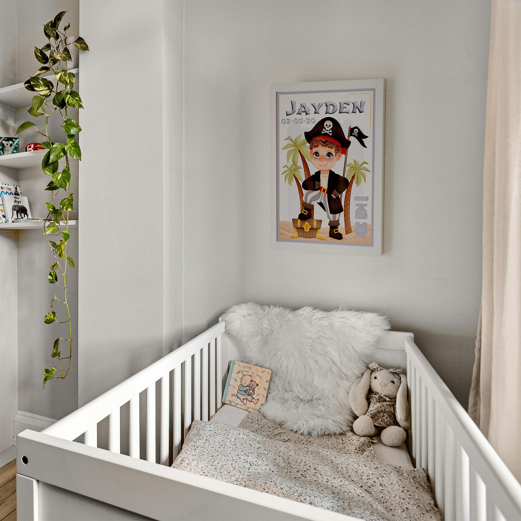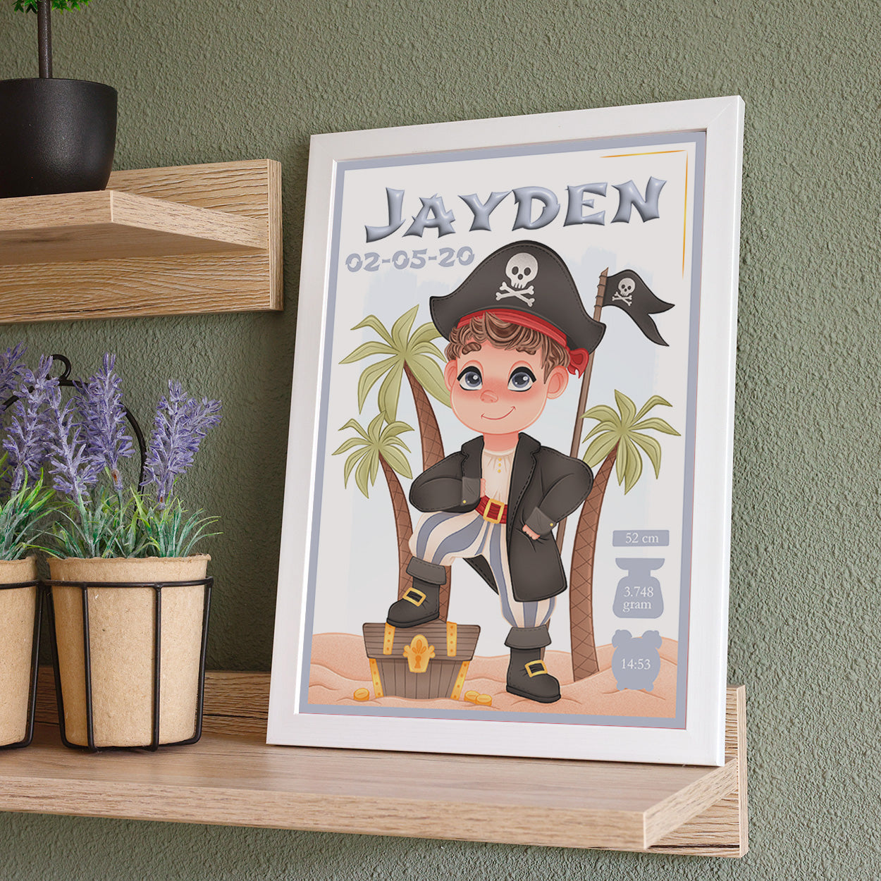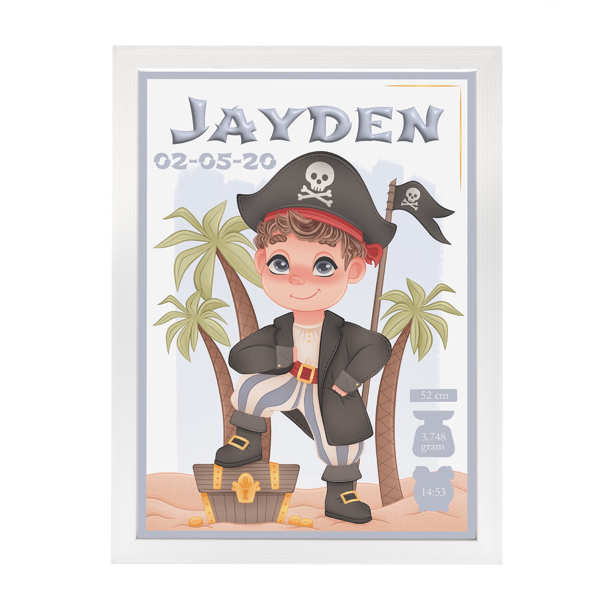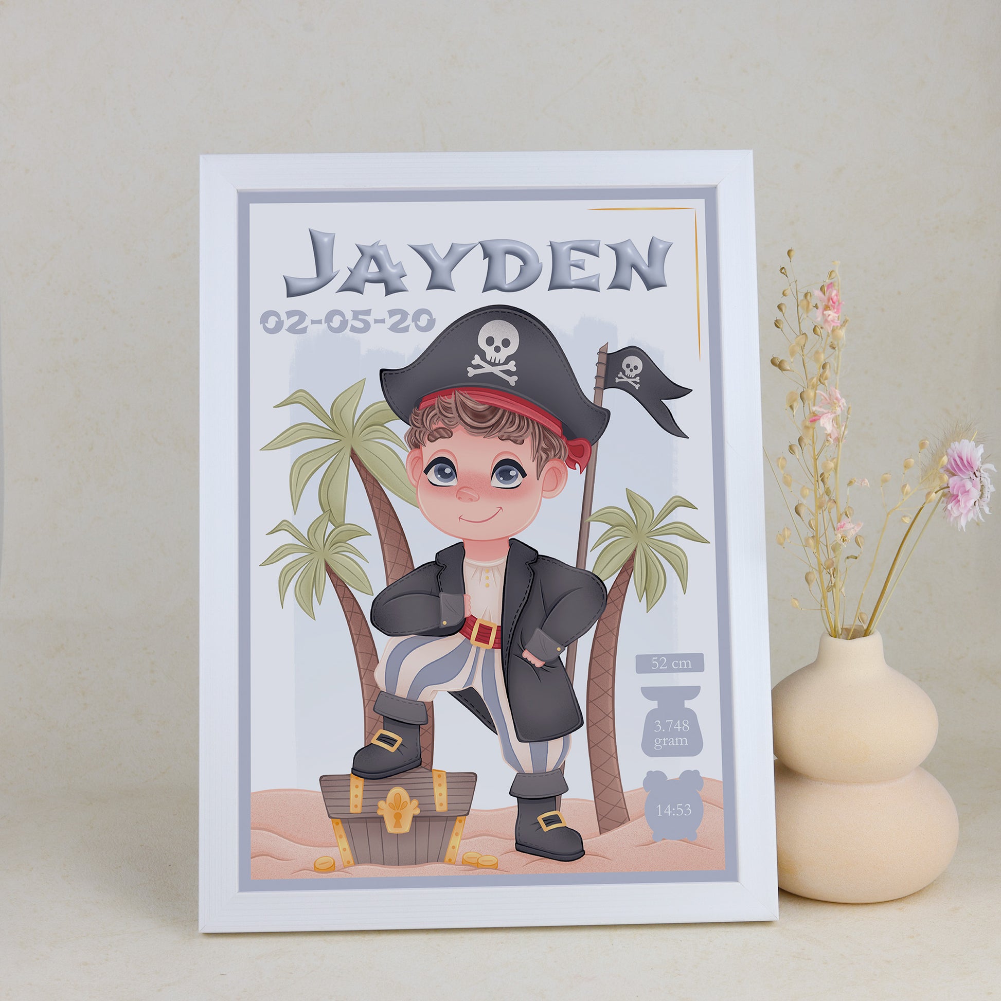 Ahoy, er is een nieuw kleintje aan boord! Deze stoere geboortelijst met een originele piraatillustratie is speciaal ontworpen door Presents2Give en brengt een avontuurlijke sfeer in elke kinderkamer. De vrolijke piraat staat centraal op de poster, met boven hem de naam van de baby in het groot, samen met de geboortedatum, het gewicht, de tijd en de lengte. Een blijvende herinnering aan de dag dat jullie matroos aan boord kwam.