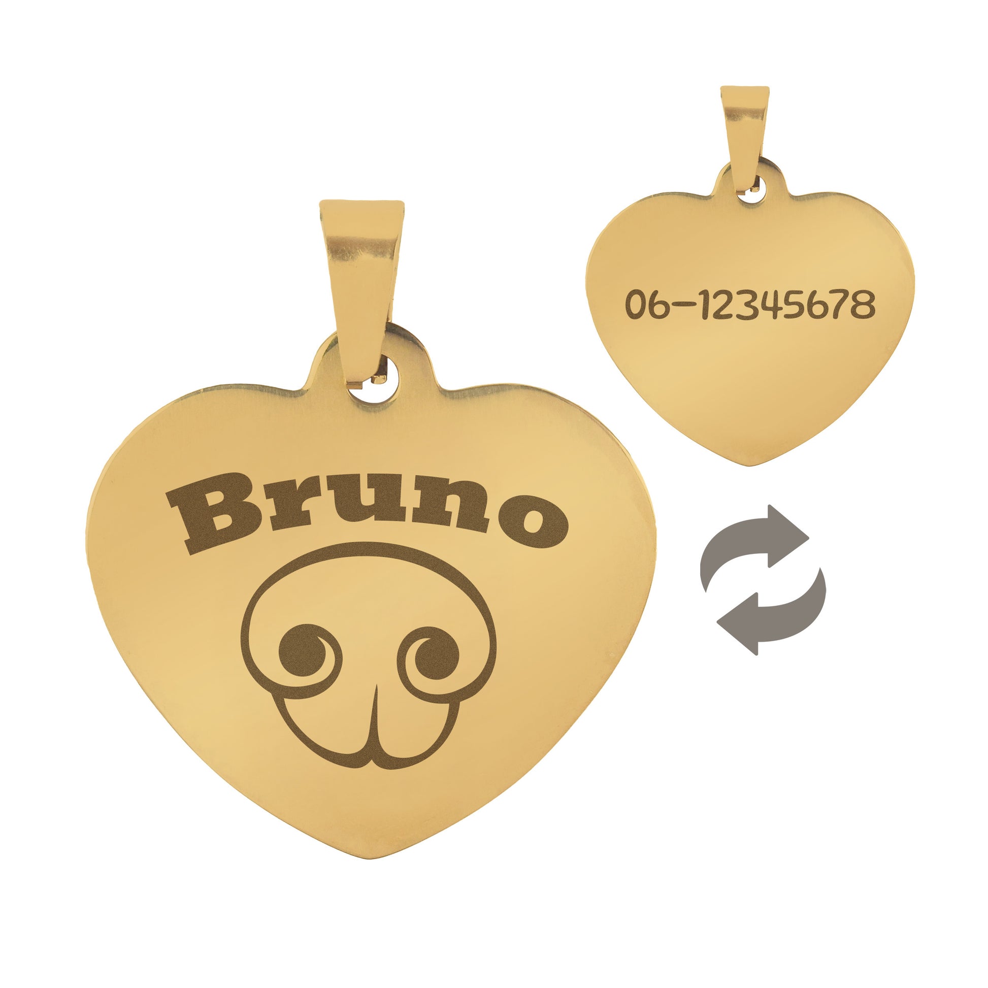 De hondenpenning heeft de vorm van een hartje en is gemaakt van roestvrij staal. Verkrijgbaar in een goud- of zilverkleurige uitvoering, zodat je eenvoudig een variant kiest die perfect past bij de halsband én bij je hond.