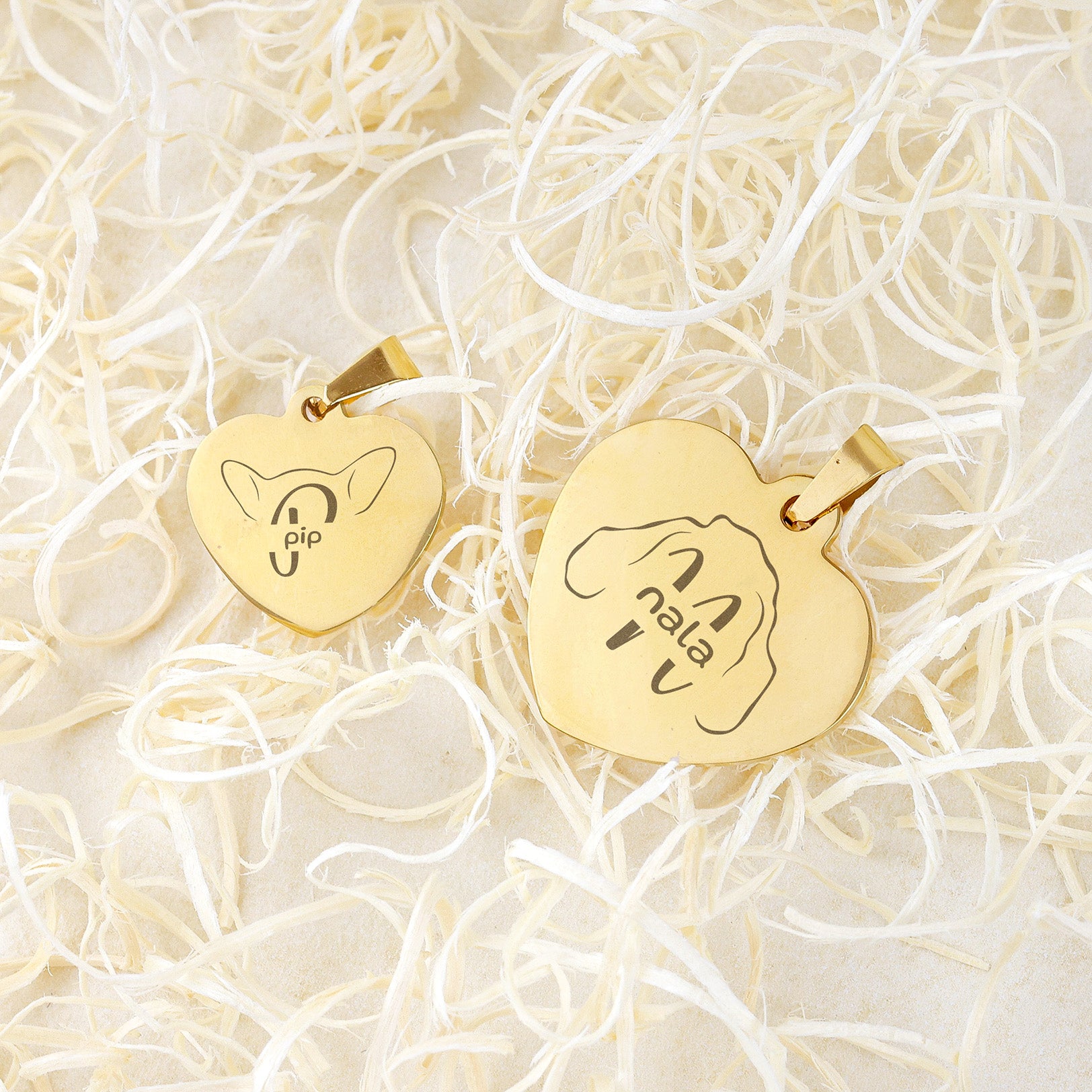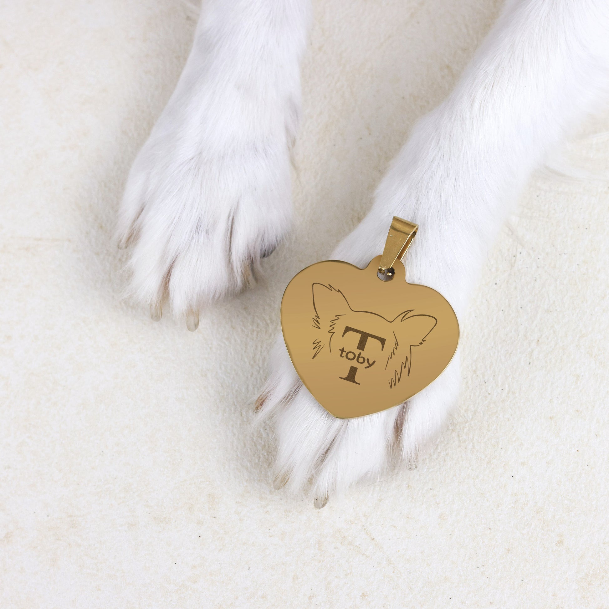 De hondenpenning heeft de vorm van een hartje en is gemaakt van roestvrij staal. Verkrijgbaar in een goud- of zilverkleurige uitvoering, zodat je eenvoudig een variant kiest die perfect past bij de halsband én bij je hond.
