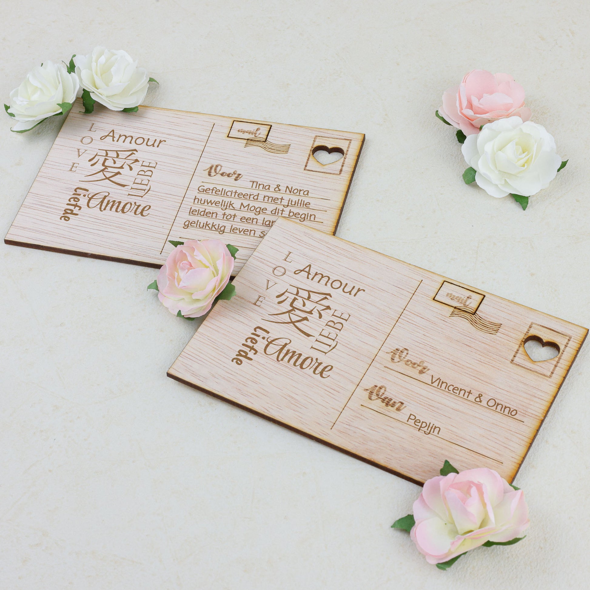 Vier de eeuwige liefde en verbondenheid van het pasgetrouwde paar met onze prachtige houten kaart, met zorg vervaardigd uit hoogwaardig, natuurlijk hout voor een unieke en tijdloze uitstraling. Met verfijnde gravures en een warme, organische uitstraling straalt deze kaart een gevoel van authenticiteit uit, perfect om de felicitaties en beste wensen over te brengen voor een leven vol liefde en geluk. .
