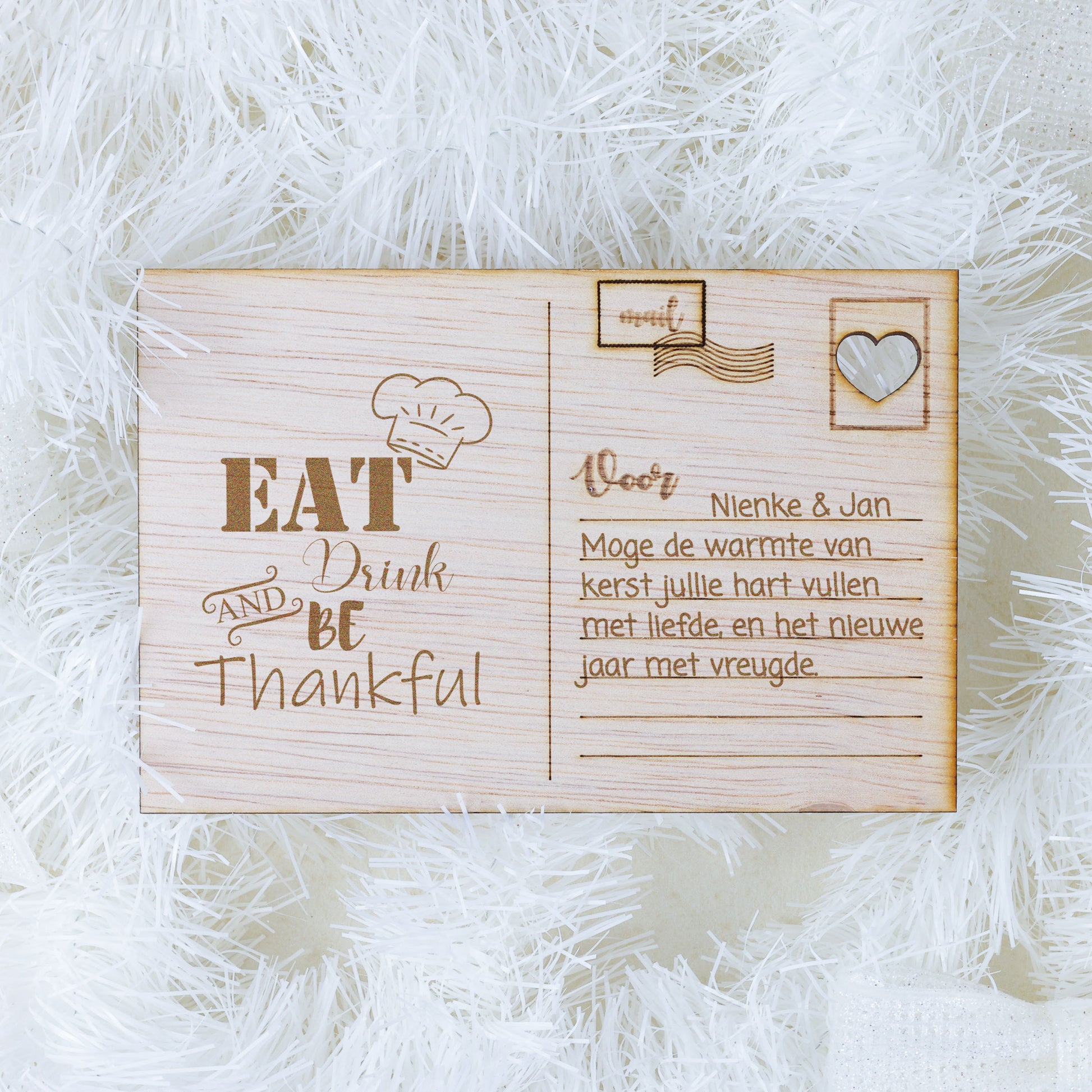 Met behulp van een laser snijder snijden we de kaart en graveren we ook de tekst en quote erop. Zo blijft de tekst permanent op de kaart staan. Daarnaast leveren we een handig standaardje waar je de kaart in kunt zetten. Zo kun je de kaart mooi tentoonstellen!