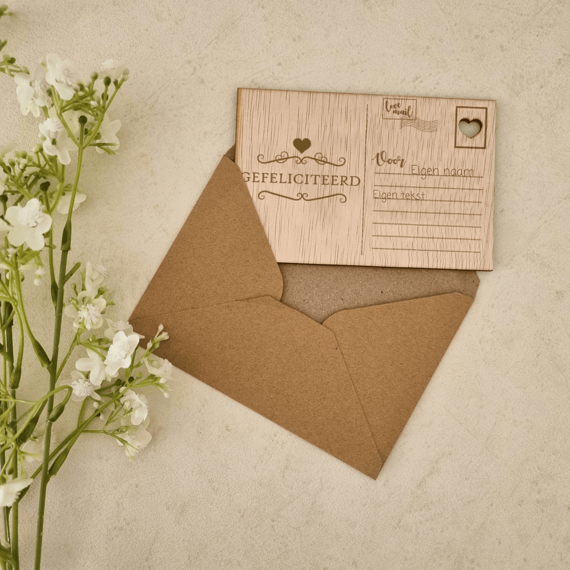 Vier de speciale dag van je dierbare met onze betoverende houten verjaardagskaart, met zorg vervaardigd uit hoogwaardig, duurzaam hout voor een uniek en blijvend geschenk. De natuurlijke schoonheid van het hout gecombineerd met verfijnde gravures en een persoonlijke boodschap creëert een onvergetelijke kaart die de ontvanger zal koesteren als een waardevolle herinnering aan hun bijzondere dag.