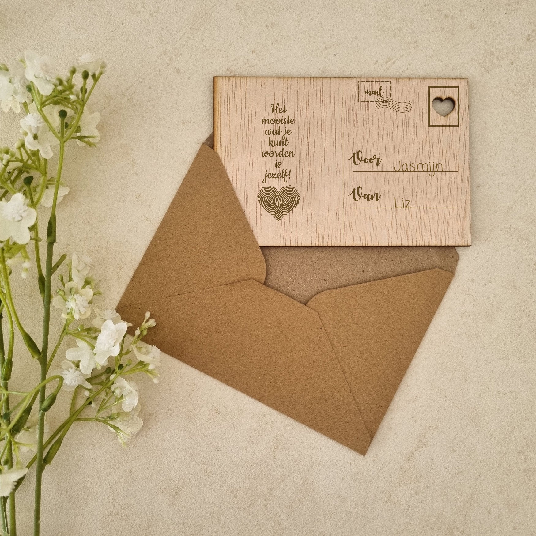 Vier de speciale dag van je dierbare met onze betoverende houten verjaardagskaart, met zorg vervaardigd uit hoogwaardig, duurzaam hout voor een uniek en blijvend geschenk. De natuurlijke schoonheid van het hout gecombineerd met verfijnde gravures en een persoonlijke boodschap creëert een onvergetelijke kaart die de ontvanger zal koesteren als een waardevolle herinnering aan hun bijzondere dag.