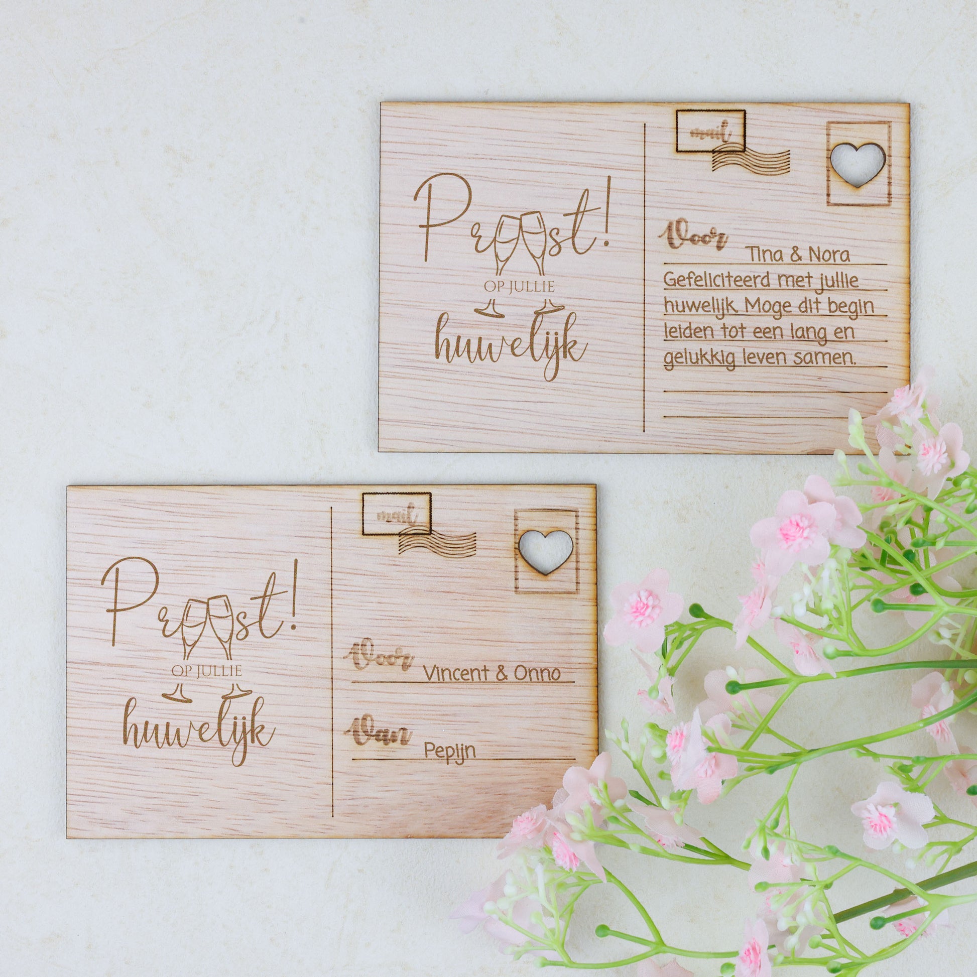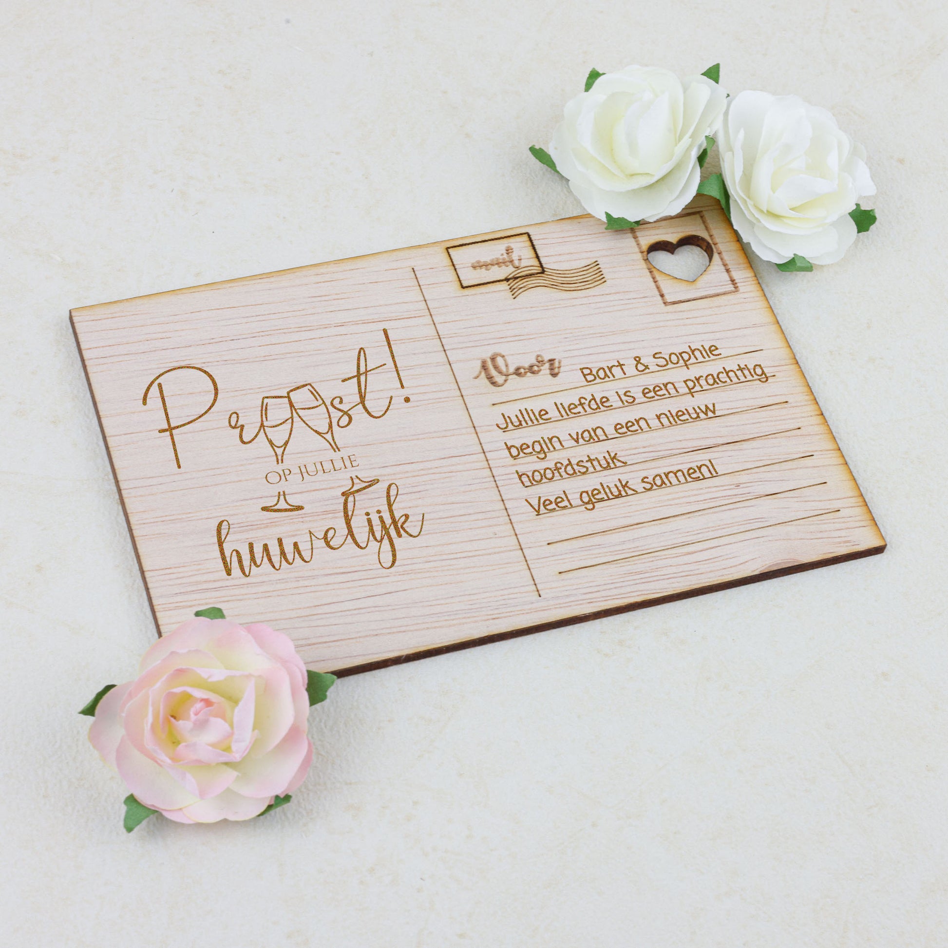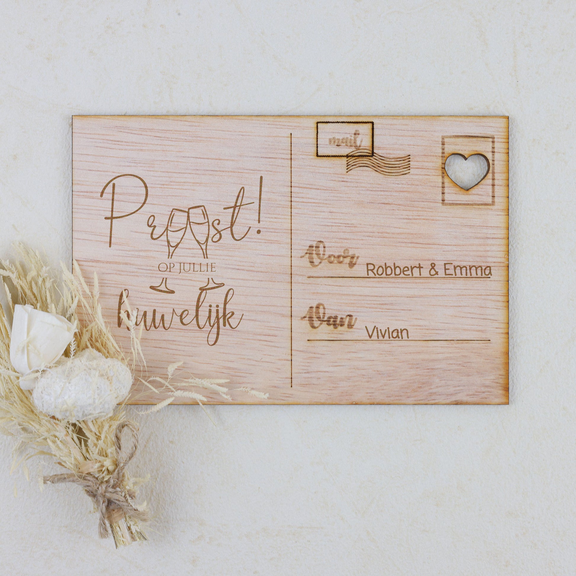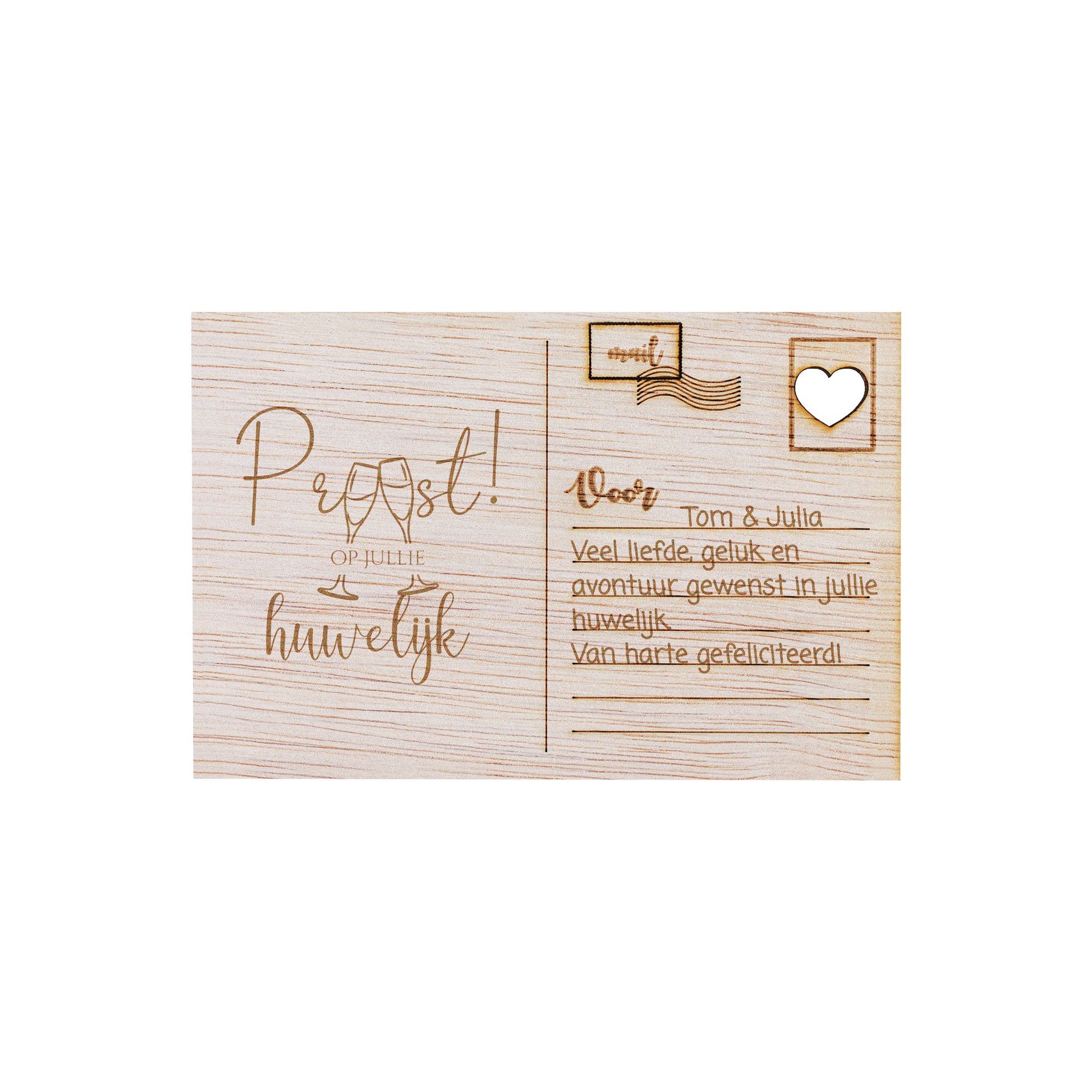 Vier de eeuwige liefde en verbondenheid van het pasgetrouwde paar met onze prachtige houten kaart, met zorg vervaardigd uit hoogwaardig, natuurlijk hout voor een unieke en tijdloze uitstraling. Met verfijnde gravures en een warme, organische uitstraling straalt deze kaart een gevoel van authenticiteit uit, perfect om de felicitaties en beste wensen over te brengen voor een leven vol liefde en geluk. .