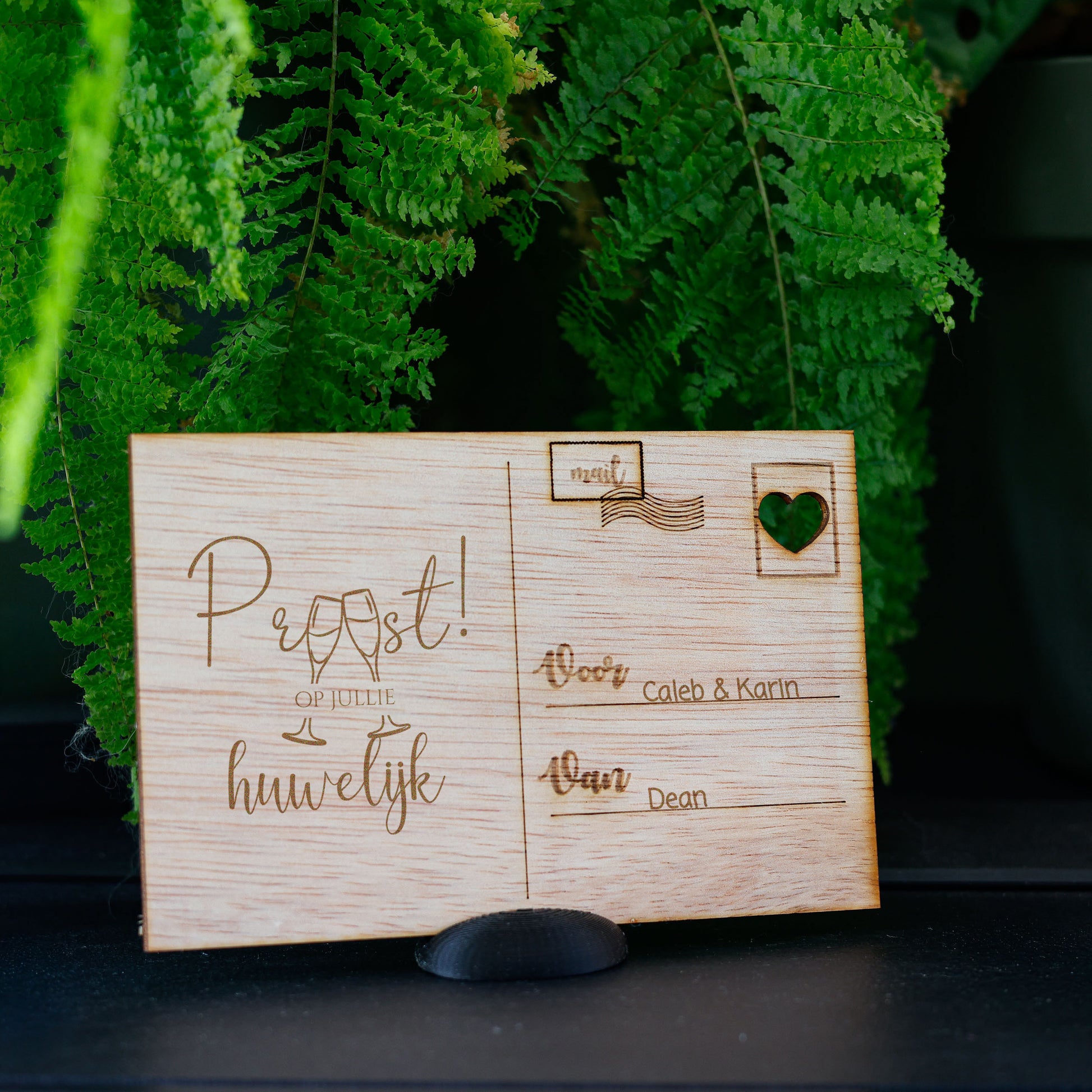 Met behulp van een laser snijder snijden we de kaart en graveren we ook de tekst en quote erop. Zo blijft de tekst permanent op de kaart staan. Daarnaast leveren we een handig standaardje waar je de kaart in kunt zetten. Zo kun je de kaart mooi tentoonstellen!