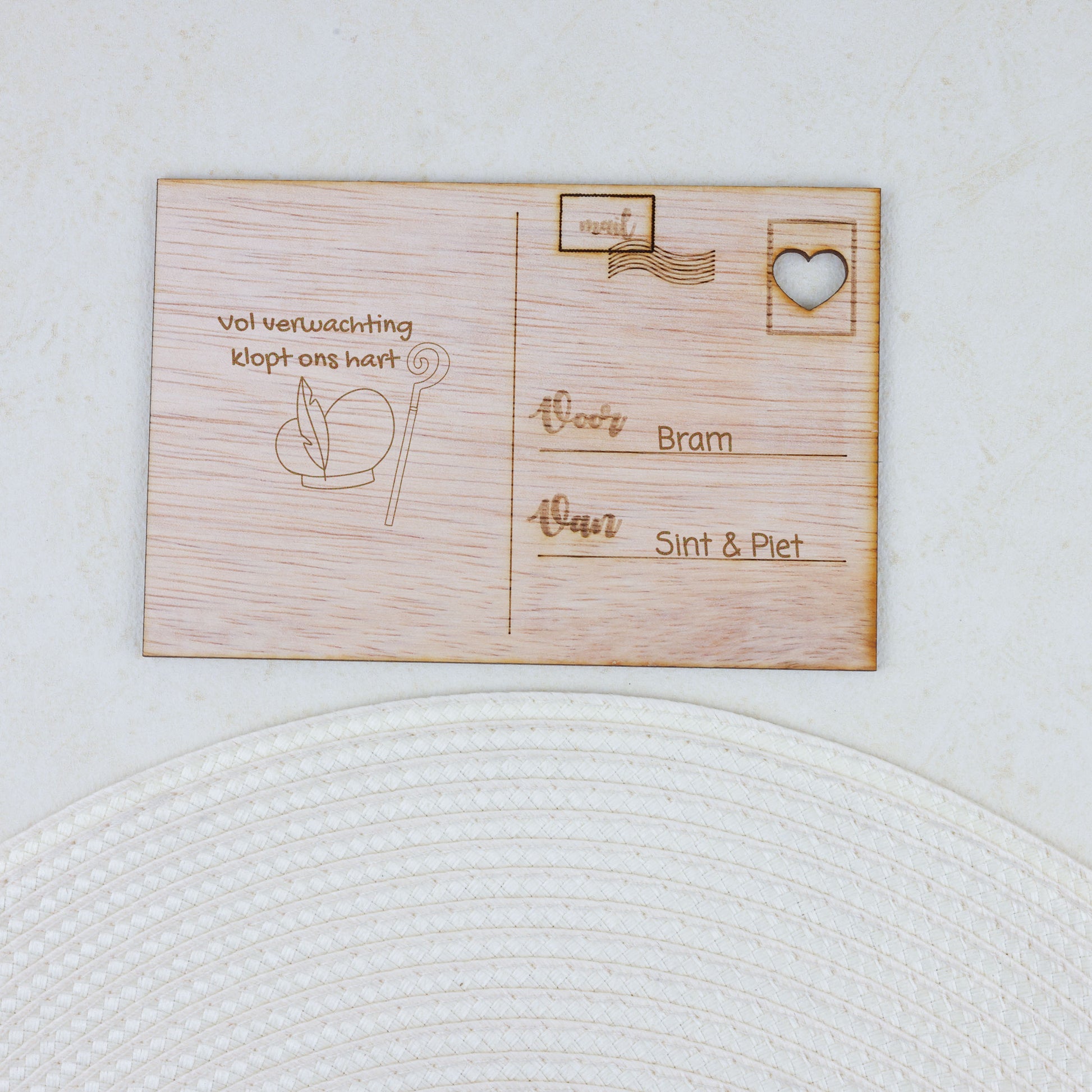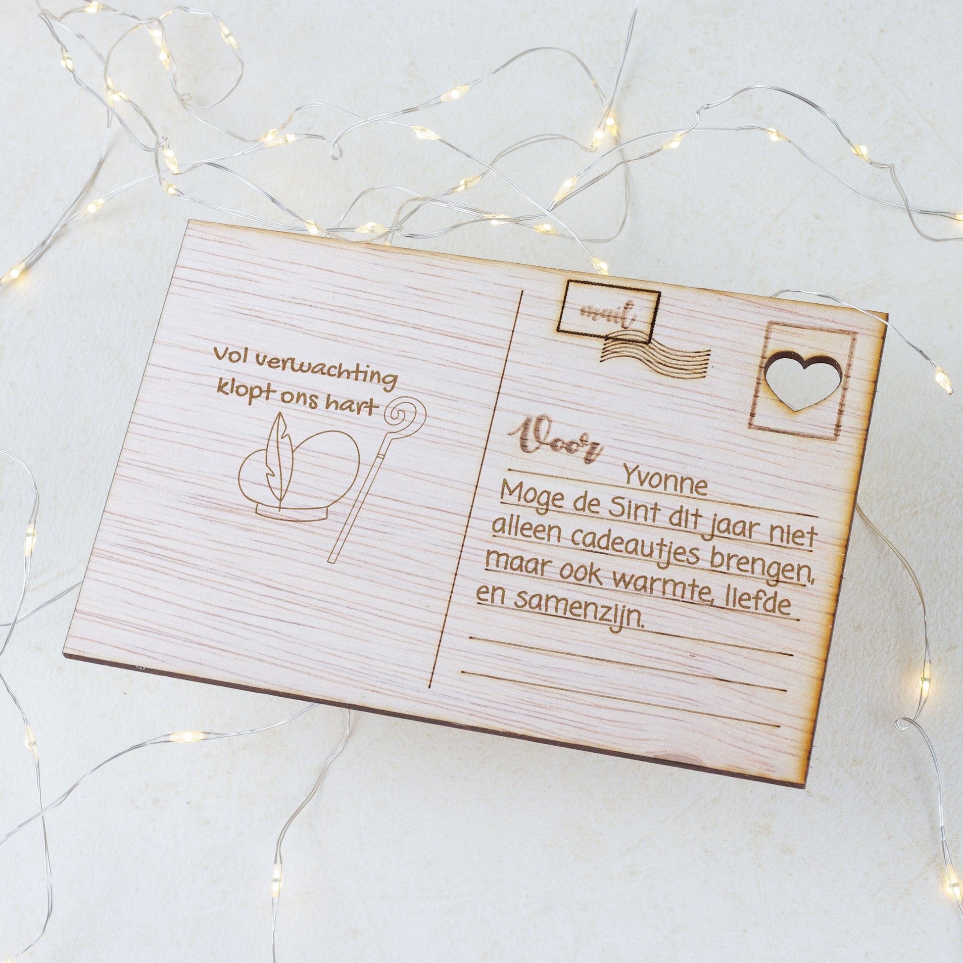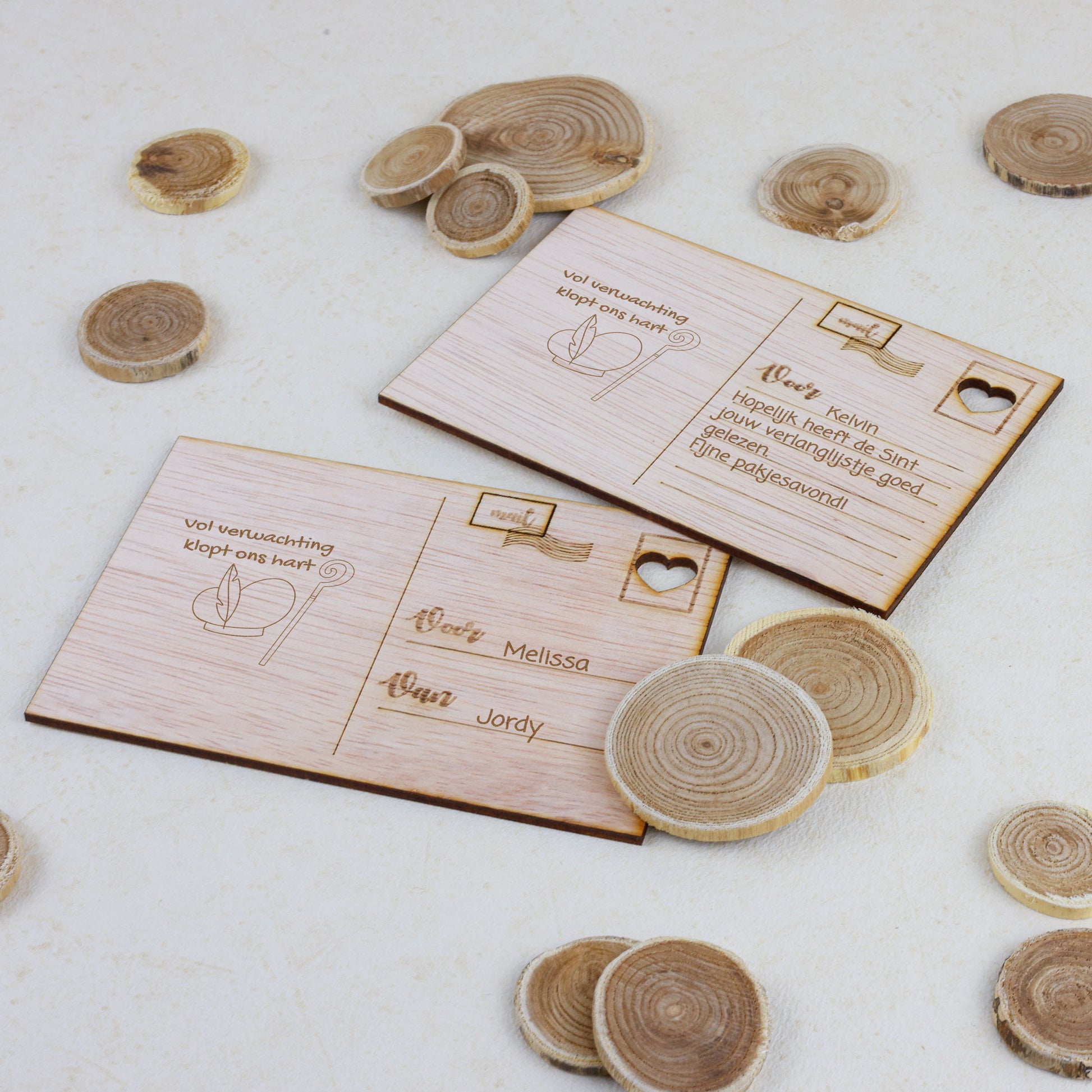 Breng warme Sinterklaasvreugde over met onze prachtige houten Sinterklaaskaart, met zorg vervaardigd uit hoogwaardig, natuurlijk hout voor een bijzonder en sfeervol geschenk. Met zijn charmante, nostalgische uitstraling en verfijnde gravures ademt deze kaart de magie van het heerlijk avondje, perfect om je Sinterklaasgroeten en lieve wensen over te brengen aan familie en vrienden. Elk detail, van de mooie houtnerf tot de feestelijke Sint- en Pietenafbeeldingen, maakt deze kaart een blijvend aandenken aan dit betoverende decemberfeest.