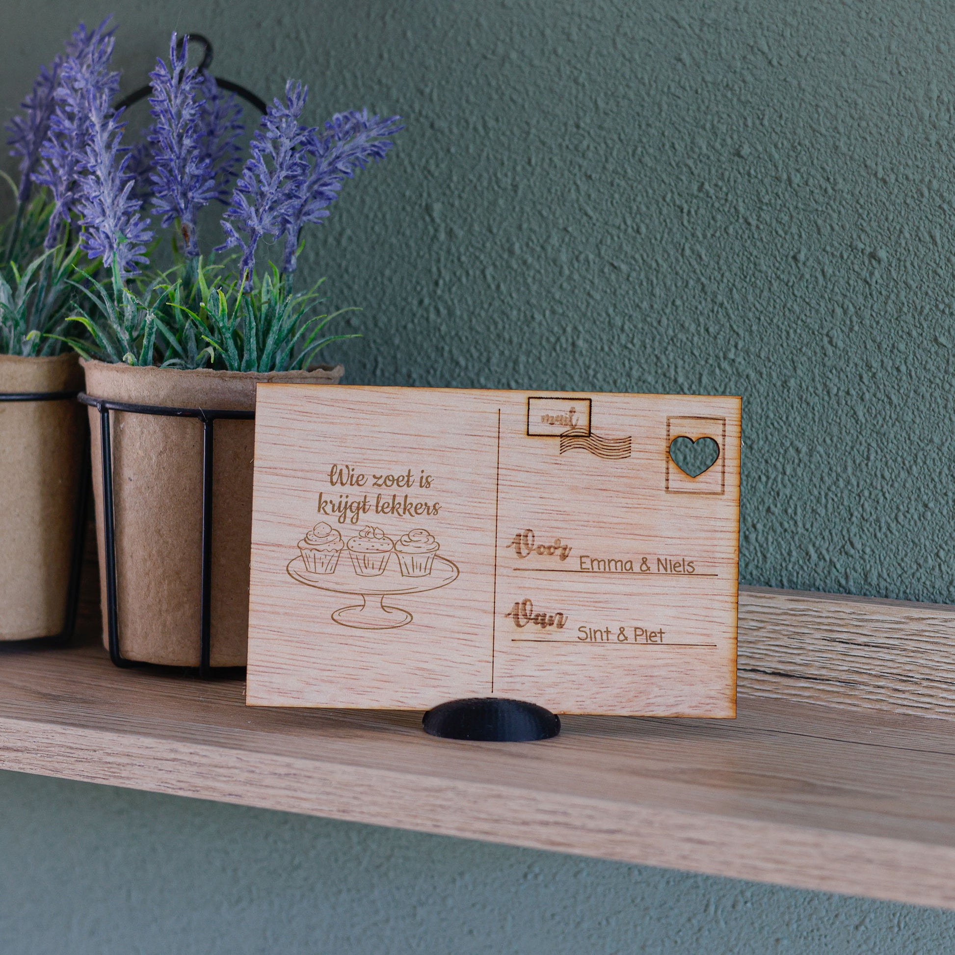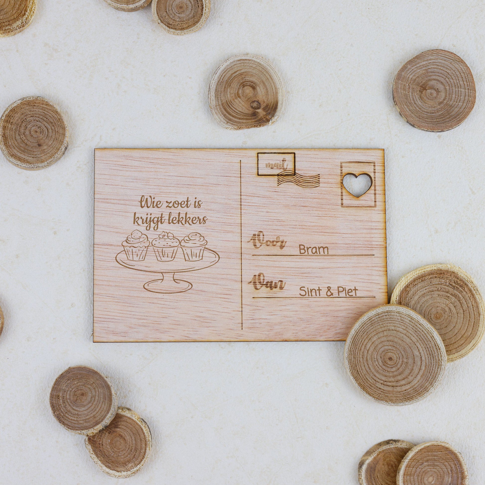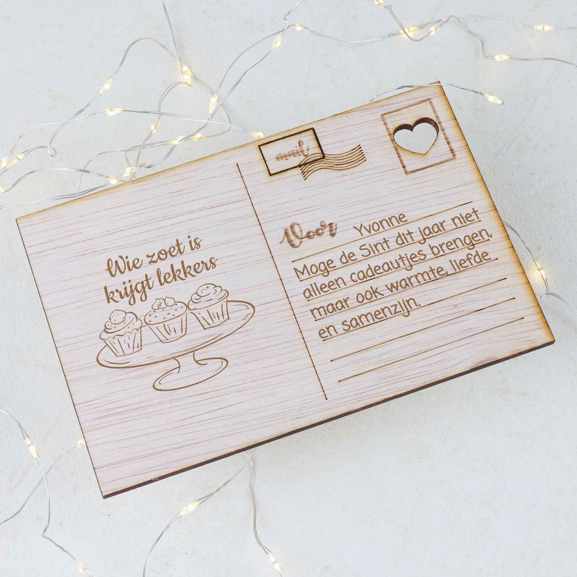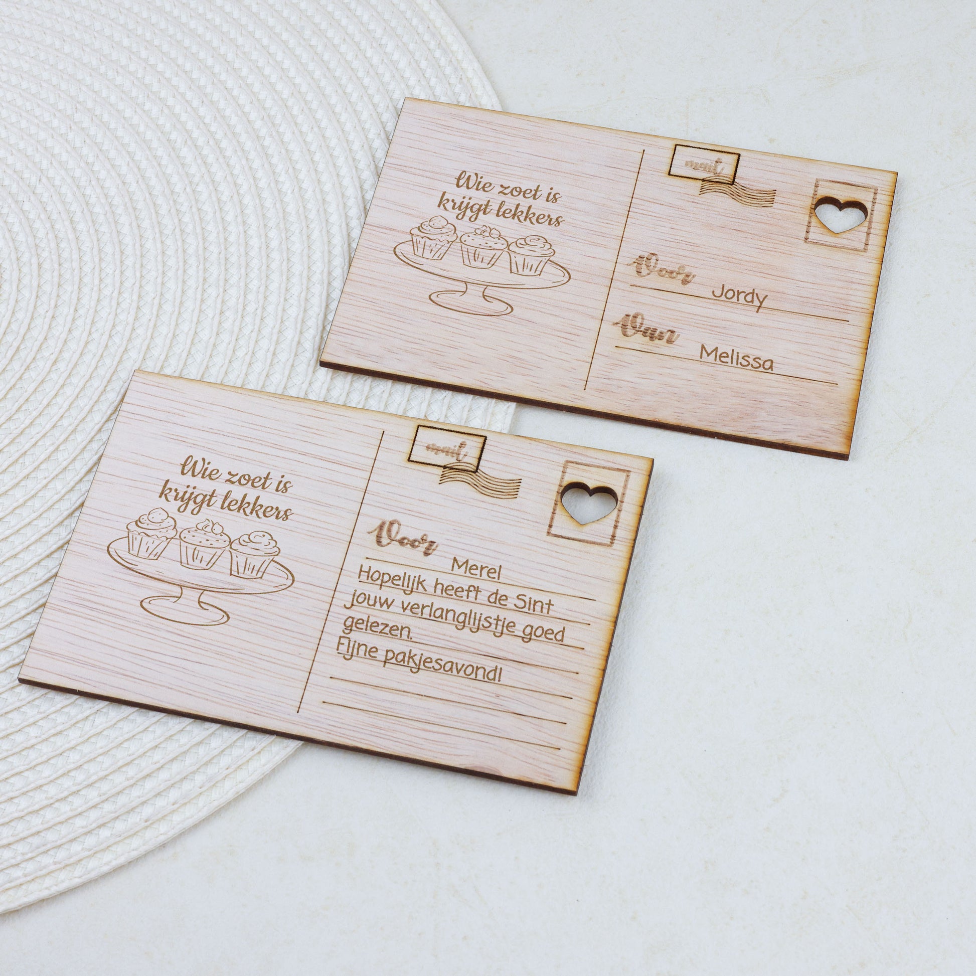 Breng warme Sinterklaasvreugde over met onze prachtige houten Sinterklaaskaart, met zorg vervaardigd uit hoogwaardig, natuurlijk hout voor een bijzonder en sfeervol geschenk. Met zijn charmante, nostalgische uitstraling en verfijnde gravures ademt deze kaart de magie van het heerlijk avondje, perfect om je Sinterklaasgroeten en lieve wensen over te brengen aan familie en vrienden. Elk detail, van de mooie houtnerf tot de feestelijke Sint- en Pietenafbeeldingen, maakt deze kaart een blijvend aandenken aan dit betoverende decemberfeest.