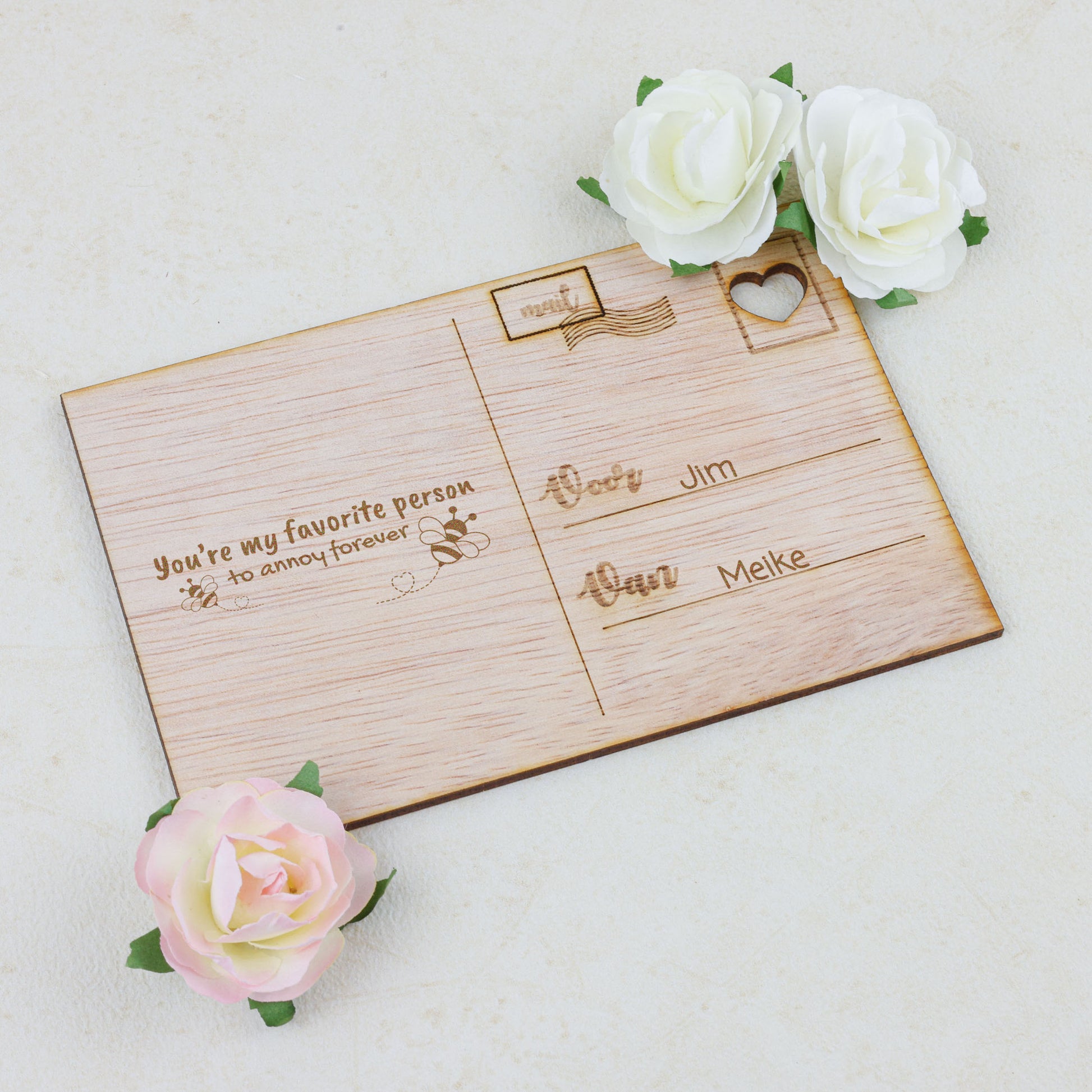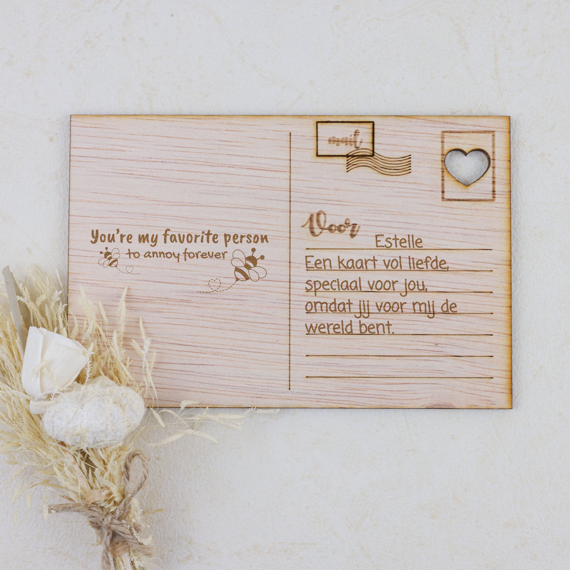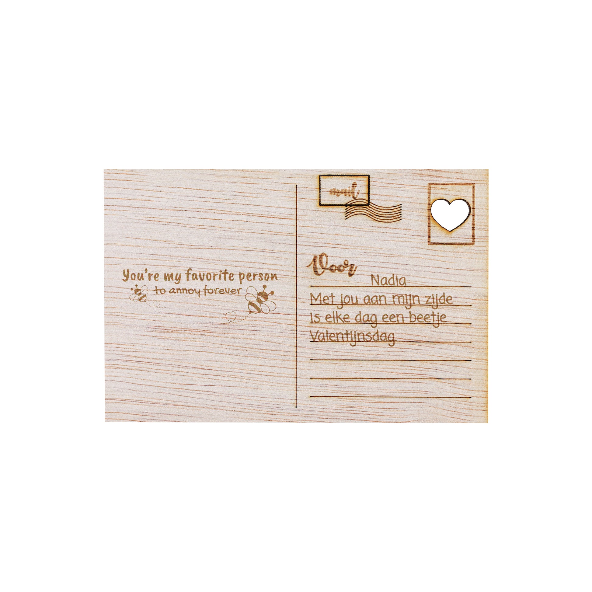 Vier de liefde op Valentijnsdag met onze prachtige houten kaart, met zorg vervaardigd uit hoogwaardig, natuurlijk hout voor een unieke en tijdloze uitstraling. De verfijnde gravures en warme, organische tinten benadrukken de romantiek en verbondenheid tussen twee harten. Deze bijzondere kaart straalt authenticiteit en liefde uit en is perfect om op Valentijnsdag je gevoelens, felicitaties en mooiste wensen te delen voor een toekomst vol liefde en geluk.