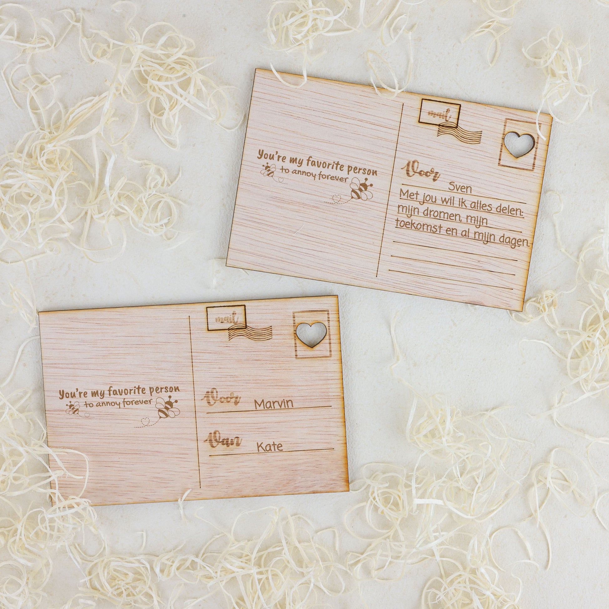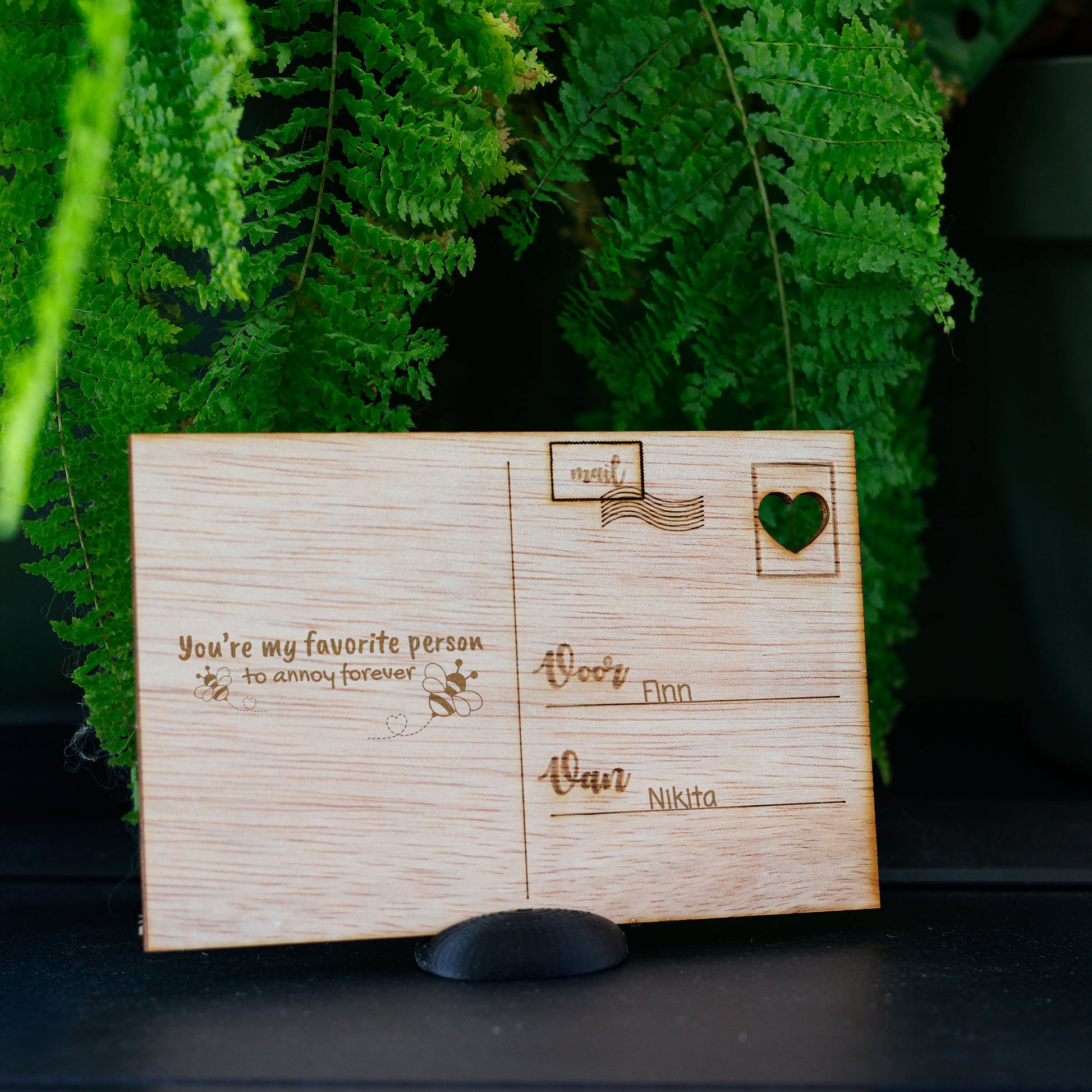 Met behulp van een laser snijder snijden we de kaart en graveren we ook de tekst en quote erop. Zo blijft de tekst permanent op de kaart staan. Daarnaast leveren we een handig standaardje waar je de kaart in kunt zetten. Zo kun je de kaart mooi tentoonstellen!