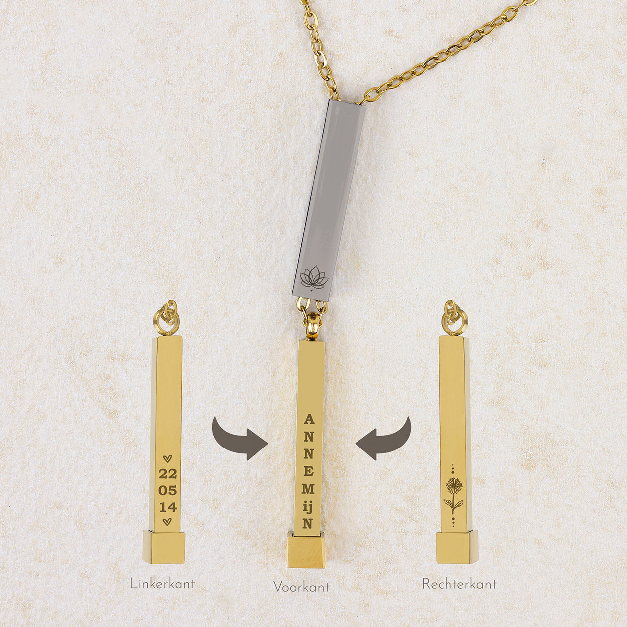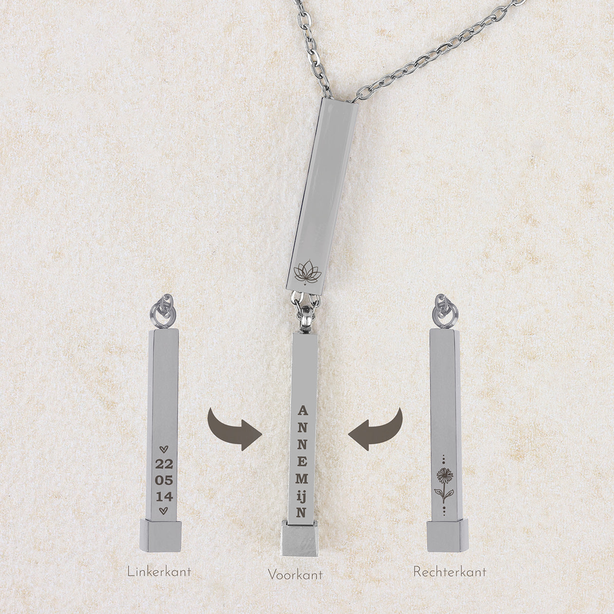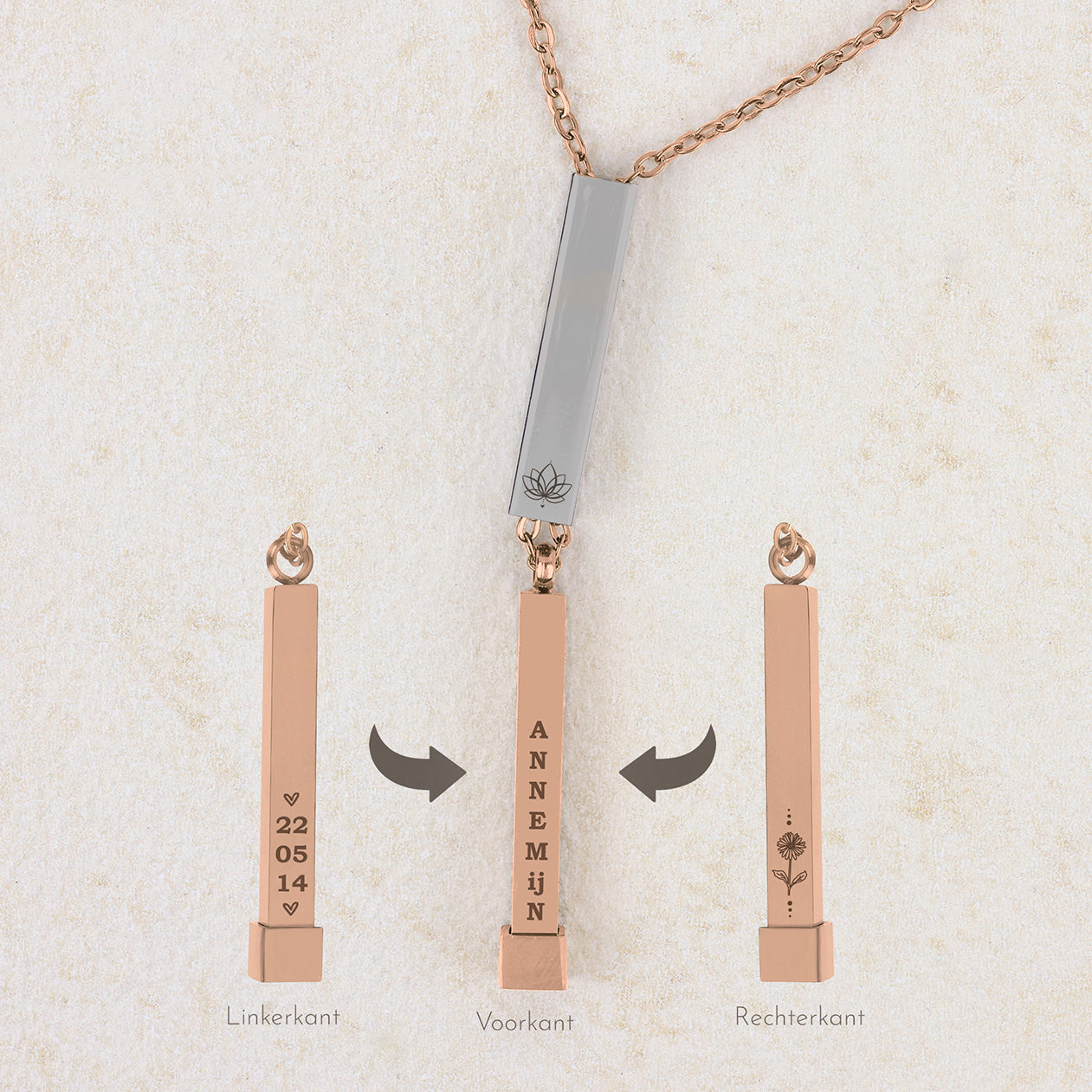 Onze betekenisvolle About You ketting: een subtiel sieraad met een bijzonder geheim, over jou. Aan de buitenkant zie je een elegant kokertje met een gegraveerde lotusbloem – hét symbool voor innerlijke kracht. Maar de echte boodschap zit vanbinnen: een verborgen staafje dat je eruit kunt schuiven, gegraveerd met de persoonlijke gegevens van jou, of een dierbaar persoon. Denk aan een naam, geboortedatum en geboortebloem – een klein, intiem verhaal dat altijd bij je gedragen wordt.