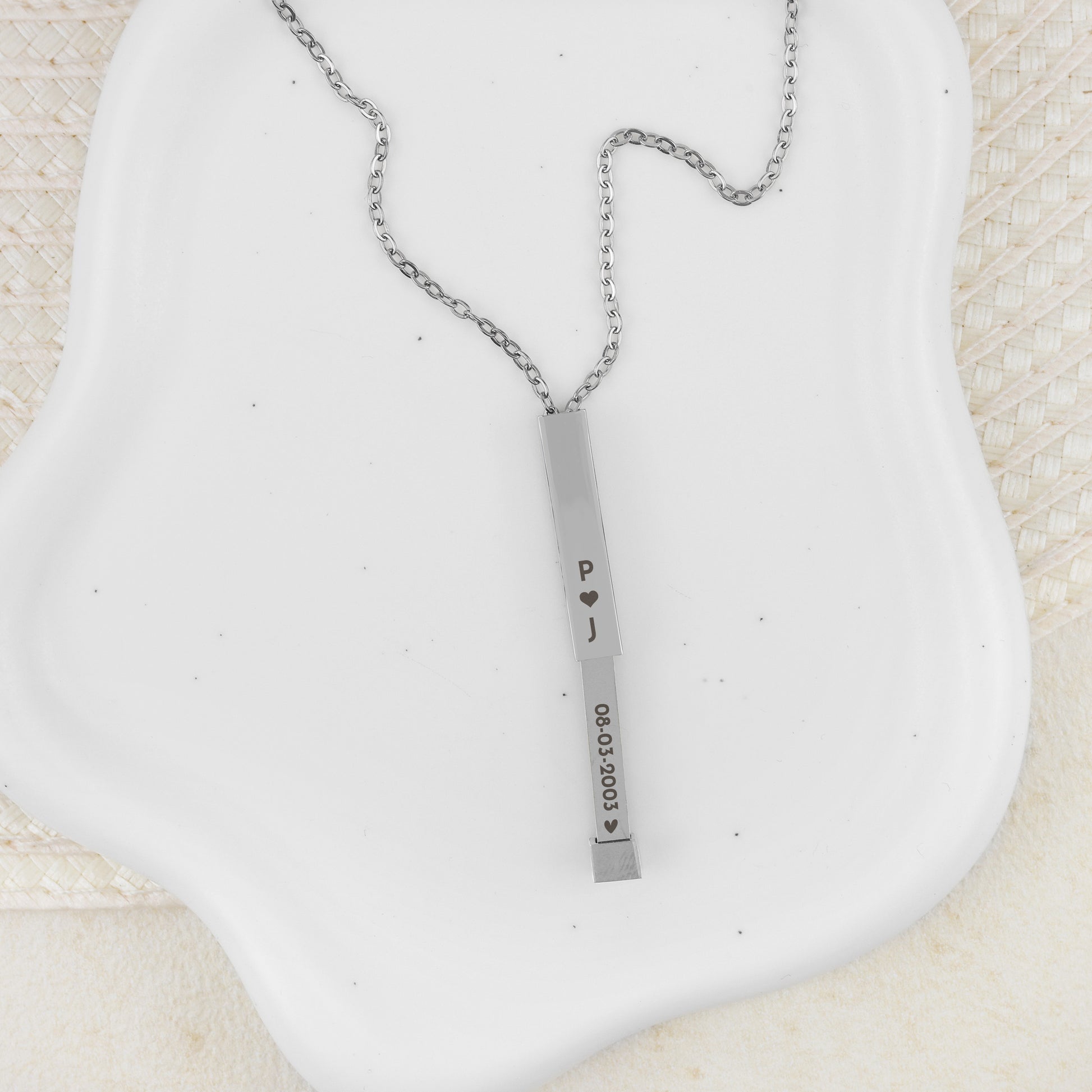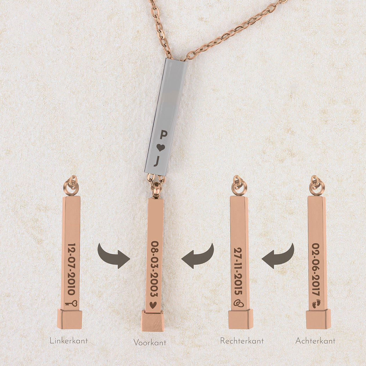 Vier jullie liefde met de betekenisvolle Our Story-ketting – een subtiel sieraad met een romantisch geheim. Aan de buitenkant zie je een elegant kokertje, gegraveerd met de initialen van jullie twee. Maar de echte magie zit vanbinnen: een uitschuifbaar staafje waarop belangrijke mijlpalen in jullie relatie zijn gegraveerd, zoals jullie eerste ontmoeting, de eerste kus of jullie trouwdag. Bij elke datum staat een bijpassend icoontje, wat het extra persoonlijk maakt.