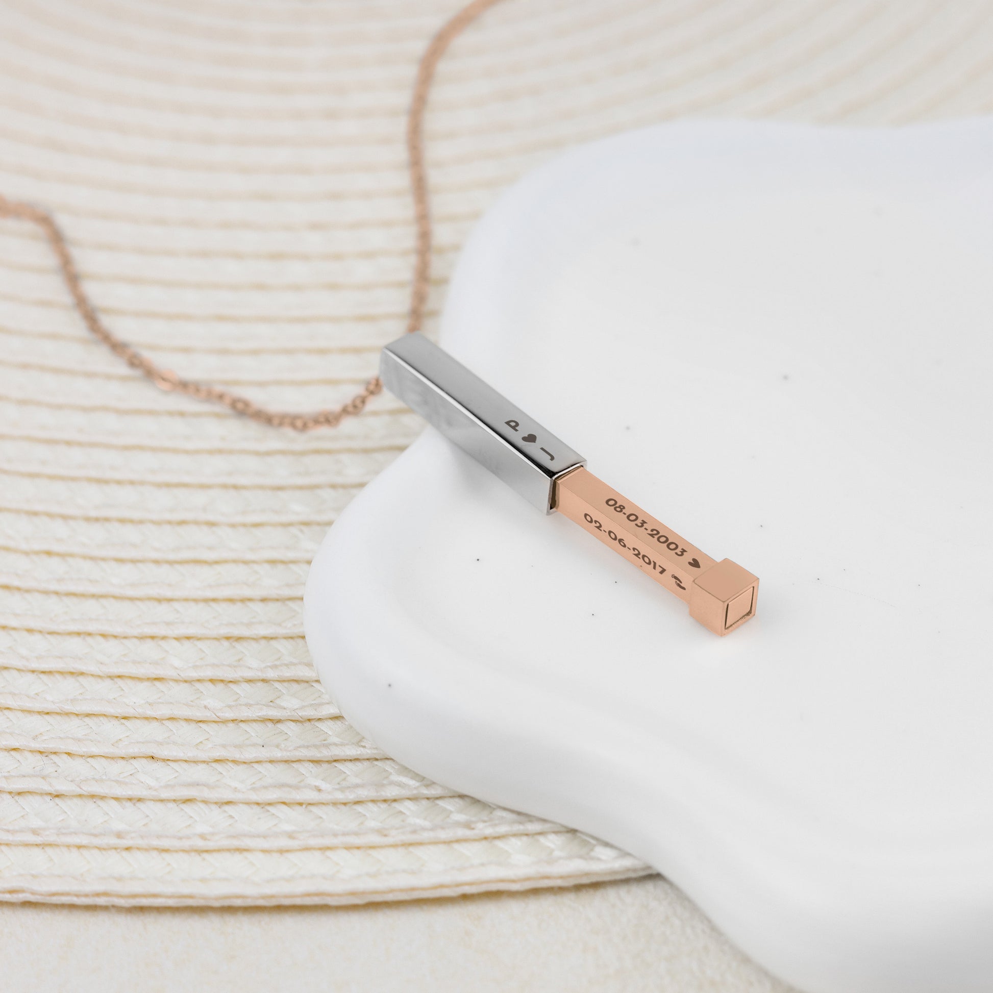 Deze ketting is perfect als cadeau voor een jubileum, bruiloft of gewoon als liefdevol gebaar. Het verborgen ontwerp zorgt ervoor dat jullie verhaal alleen zichtbaar is voor wie het wil zien – een intieme herinnering om dicht bij je hart te dragen.