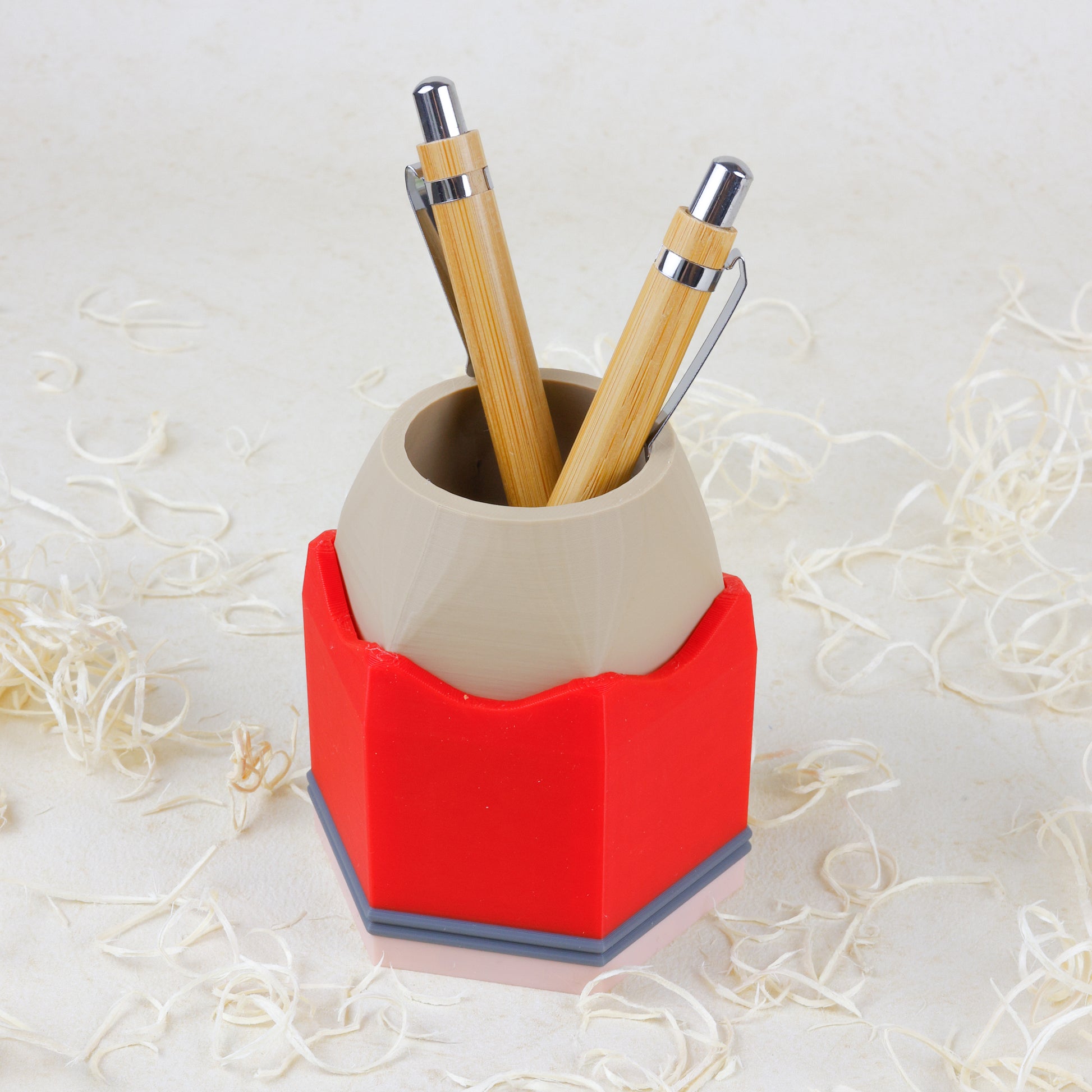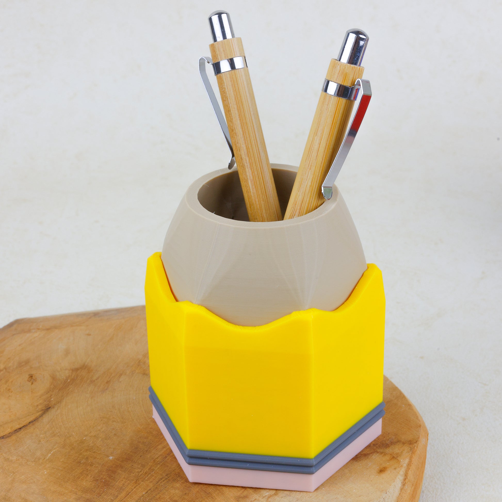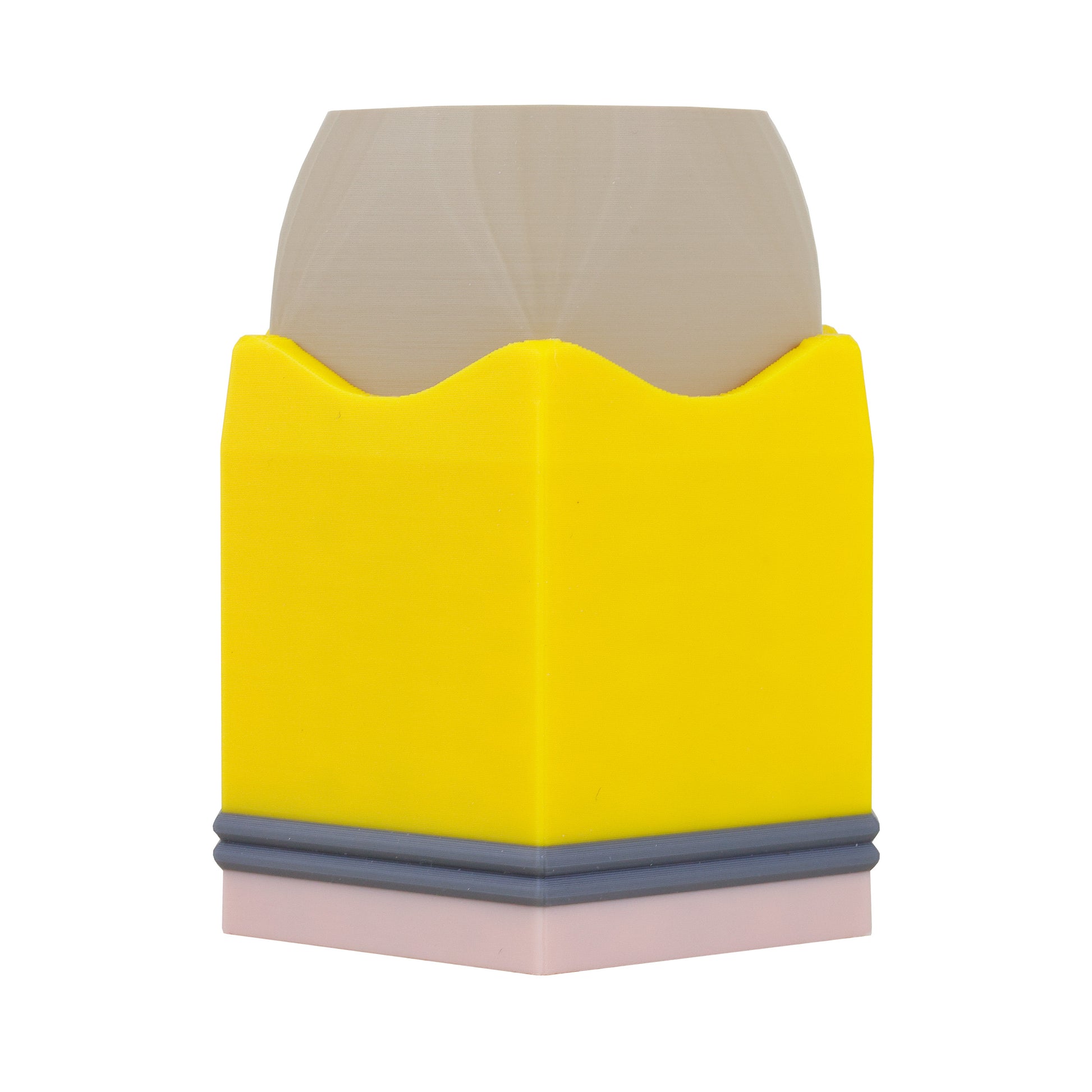 Breng kleur en vrolijkheid naar je bureau met onze potlood-pennenbak! Het bakje biedt voldoende ruimte voor pennen, potloden en andere schrijfwaren, zodat je werkplek netjes en overzichtelijk blijft. Een uniek en creatief ontwerp voor op je bureau, dat daarnaast ook functioneel is. Het pennenbakje is verkrijgbaar in rood, geel en blauw, en wordt met zorg gemaakt met een 3D-printer.