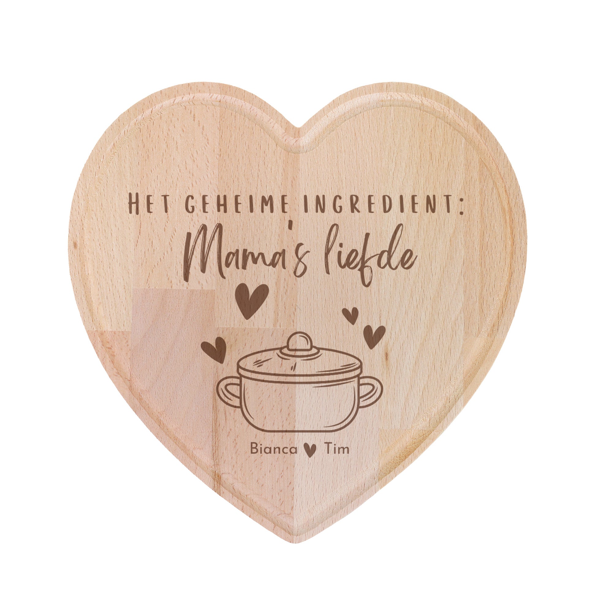 Deze liefdevolle snijplank in de vorm van een hart is het perfecte cadeau om jouw waardering voor mama te laten zien. De tekst “Het geheime ingrediënt: mama's liefde” wordt stijlvol in het hout gegraveerd, met daaronder ruimte om jullie eigen namen toe te voegen — alsof het cadeau persoonlijk is ondertekend met jullie liefde. Zo wordt deze snijplank niet alleen een praktisch item in de keuken, maar ook een blijvende herinnering aan een liefdevol gebaar.