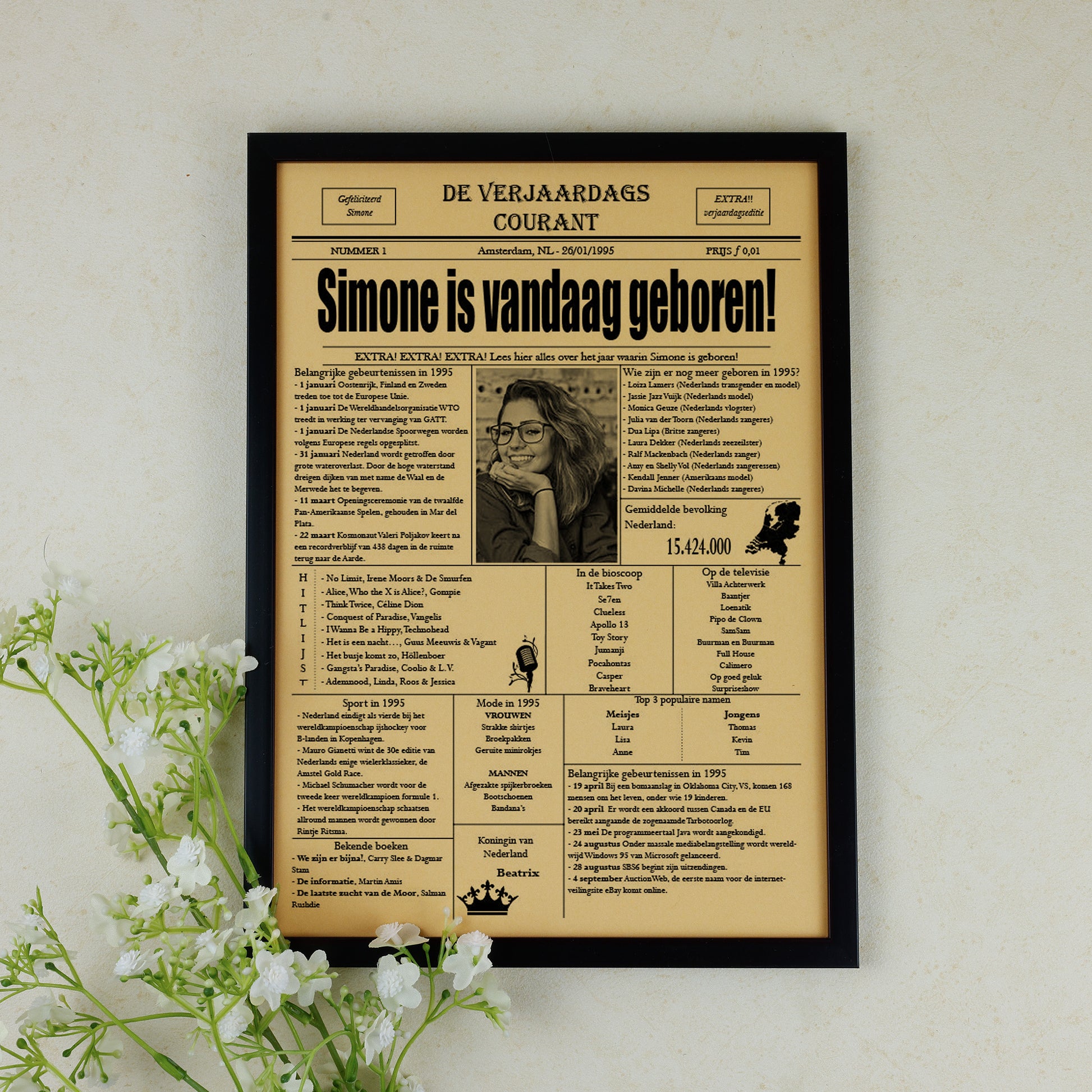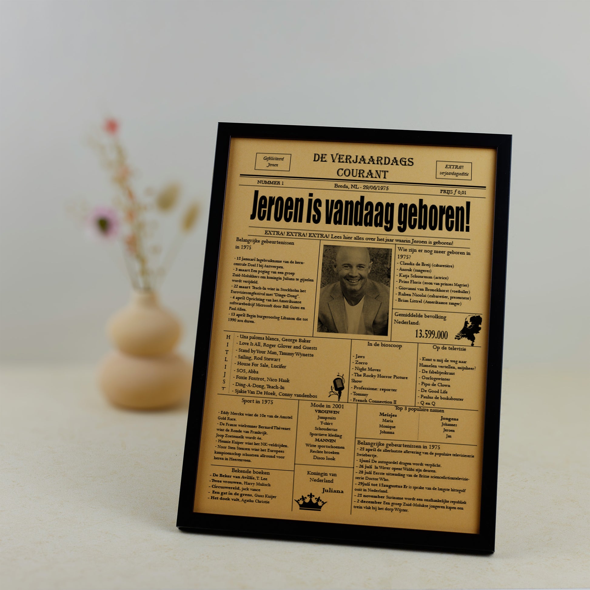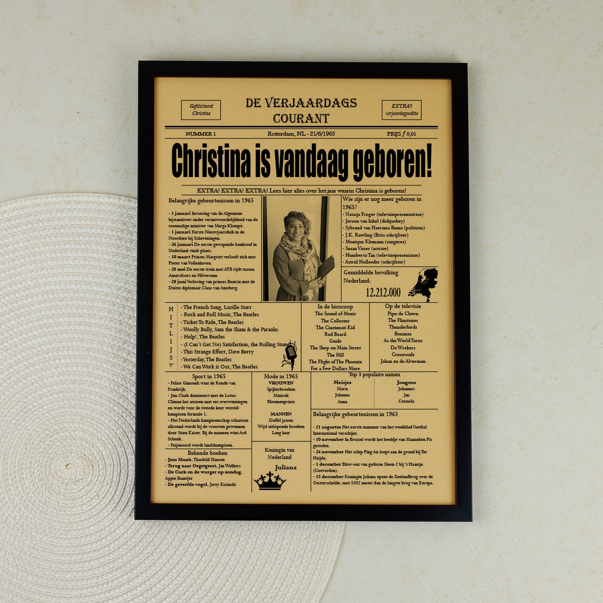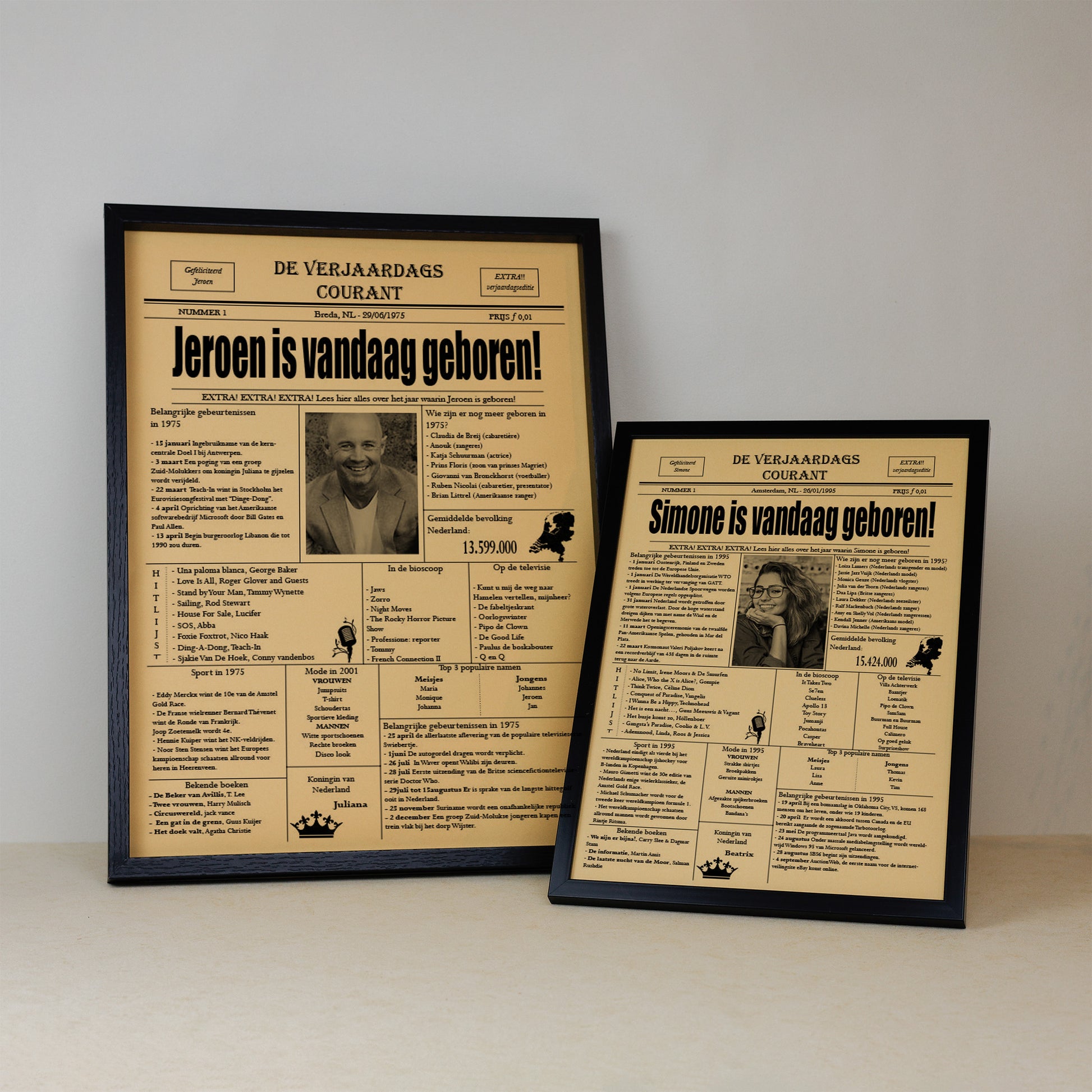 Op zoek naar een uniek en persoonlijk cadeau voor een verjaardag? Dan is onze verjaardagkrant met allerlei weetjes en feitjes over het jaar dat de jarige geboren is de perfecte keuze! Onze kranten kunnen worden aangepast met de naam, foto en persoonlijke gegevens van de jarige. Zo creëer je een unieke poster die niet alleen de herinneringen vastlegt, maar ook een geweldige decoratie is voor elke kamer in huis. Of je nu op zoek bent naar een cadeau voor je partner, vrienden of familie, onze verjaardagkrant is een geweldige keuze.